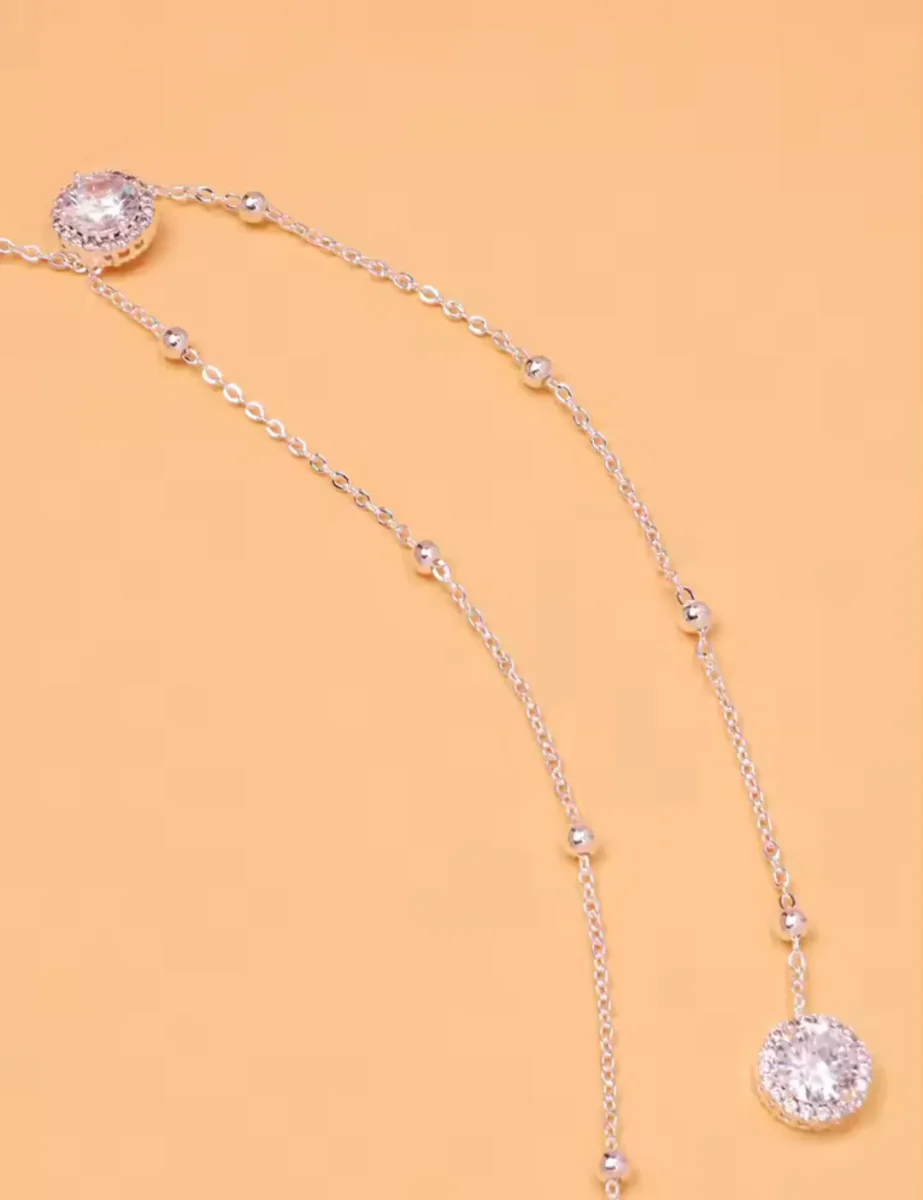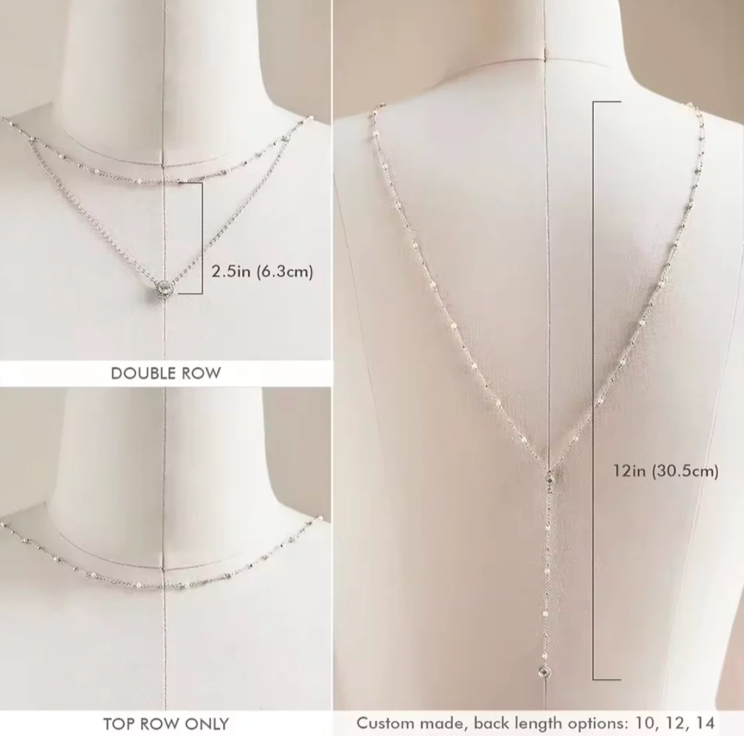 Designed to enhance open-back dresses, this delicate necklace is the epitome of refined beauty. At the front, a fine double chain graces the neckline with a single sparkling crystal. At the back, a single chain drapes gracefully down the spine, adorned with two shimmering crystals that catch the light with every movement. Perfect for a bride or any elegant occasion, this necklace adds a touch of glamour and sophistication to your look.