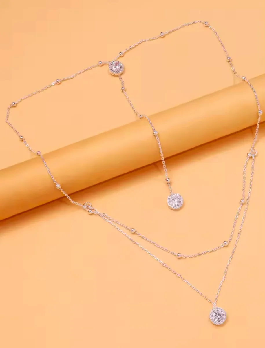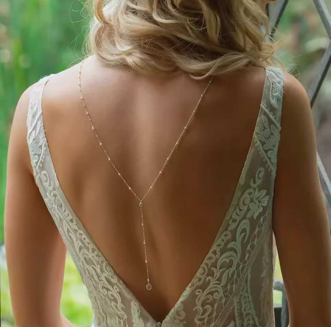 Conçu pour mettre en valeur les robes à dos ouvert, ce collier délicat est un véritable bijou de raffinement. À l’avant, une fine chaîne double orne le décolleté avec un strass scintillant. À l’arrière, une seule chaîne descend gracieusement le long du dos, ponctuée de deux strass étincelants qui ajoutent une touche de lumière et de glamour. Parfait pour une mariée ou une occasion chic, ce collier complète votre tenue avec élégance et subtilité.