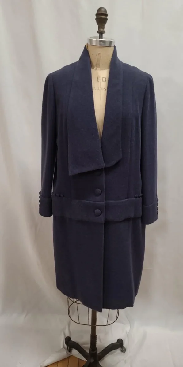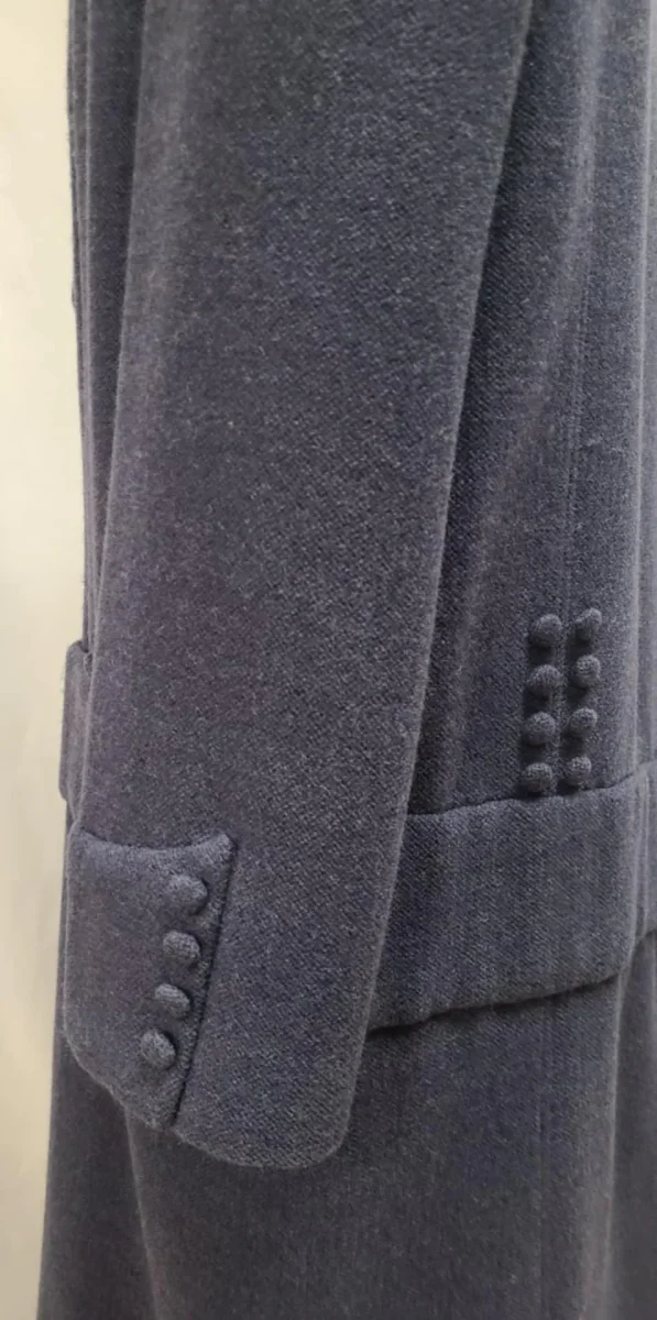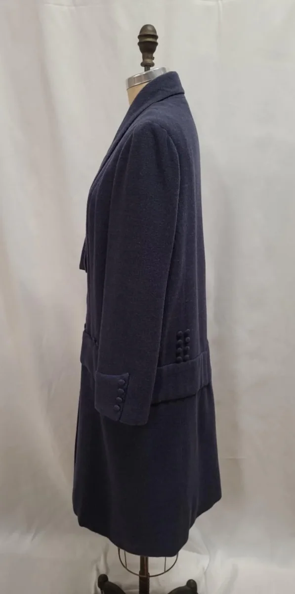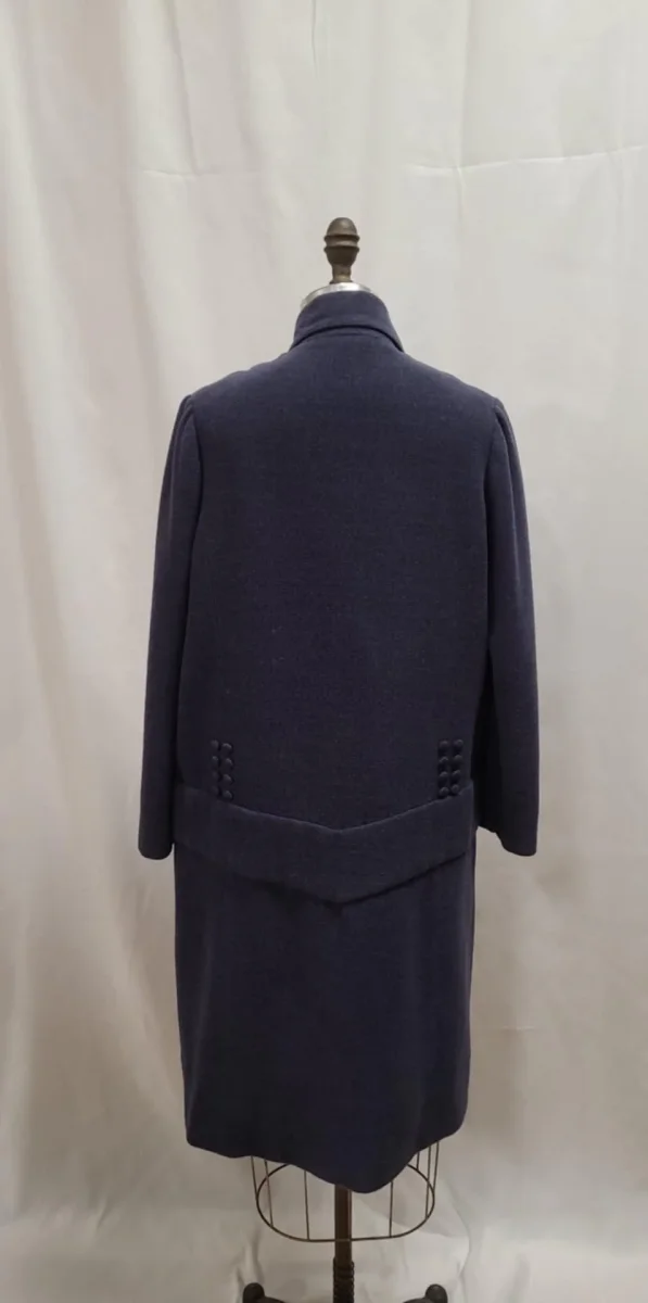 Manteau d’époque mi-long, boutonné devant. Collet asymétrique. Série de boutons décoratifs au niveau de la ceinture et au dos. Beau look des années 1920.