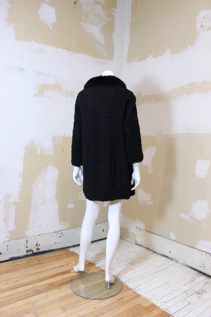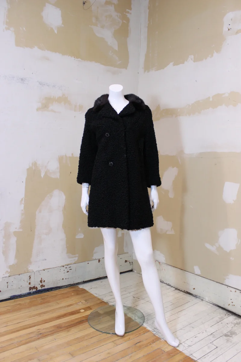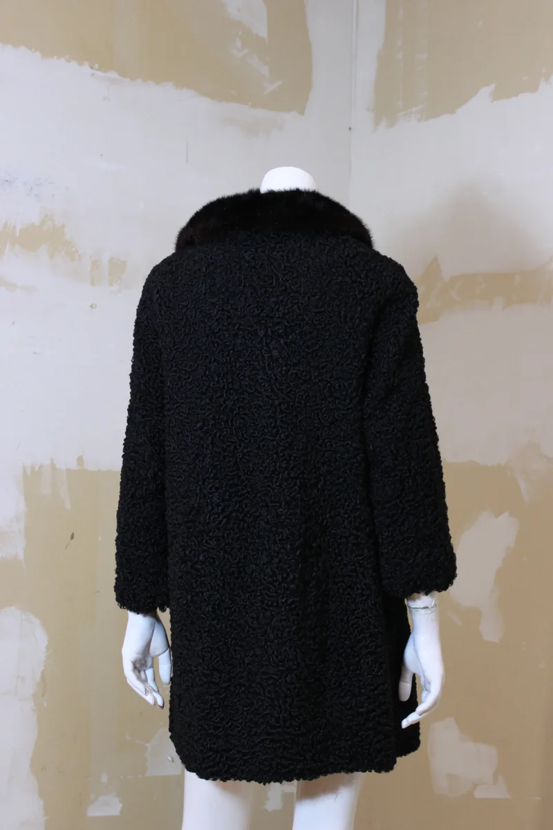 Superbe manteau de fourrure en mouton perse noir. De la marque FOURRURES G. MALO (3186 Rue Masson, Montréal), vintage. Ligne A. Se ferme au devant avec 2 attaches. Col en fourrure brune foncée. 2 poches extérieures, une poche cachée dans la doublure avec fermeture éclair.