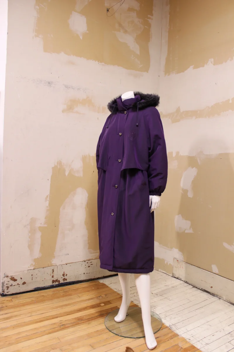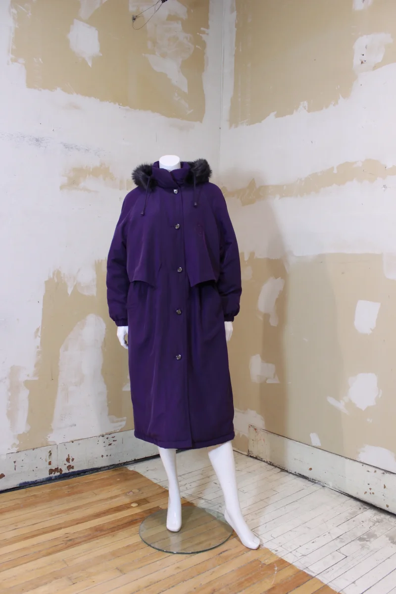 De la marque CLASSIQUE OUTWEAR COLLECTIONS, vintage. Avec capuchon amovible orné de fourrure véritable. Manches raglan avec poignets élastique. Fermeture éclair cachée par une boutonnière. Col cheminé. Cintré à la taille avec 2 cordons ajustables. Doublé. Joli écusson brodé sur la poitrine.
