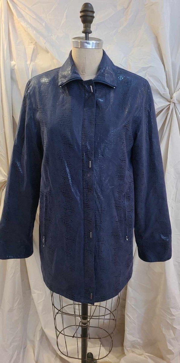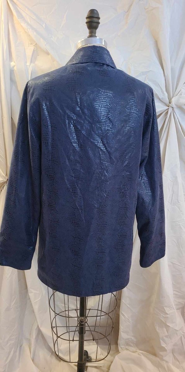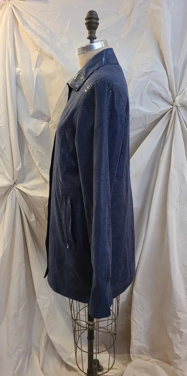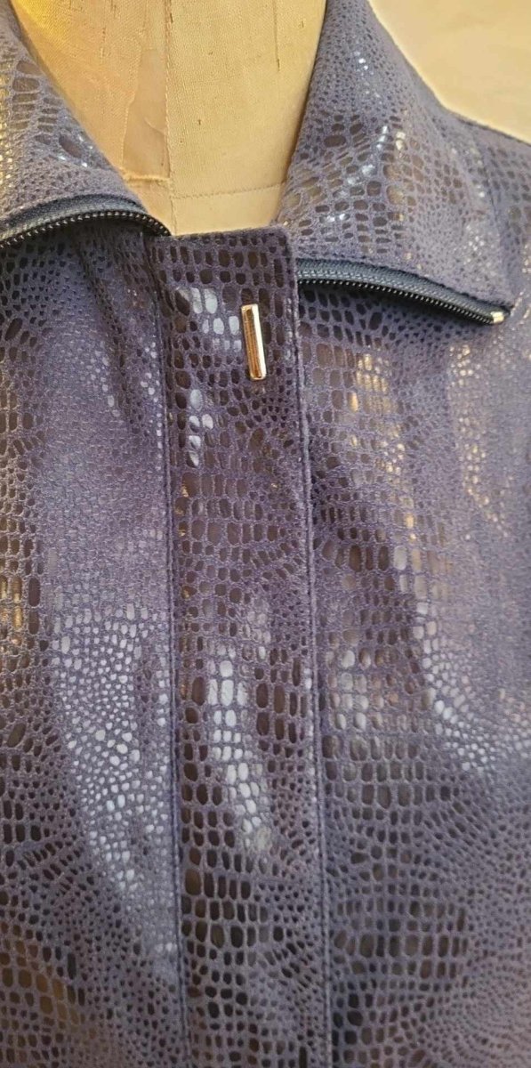 Manteau mi-saison effet cuir croco marine. Fermeture éclair et boutons pression. Deux poches extérieures et une poche intérieure. Col se ferme jusqu’en haut pour un effet cheminé. De la marque COLLECTION NUAGE, vintage. Épaulettes.