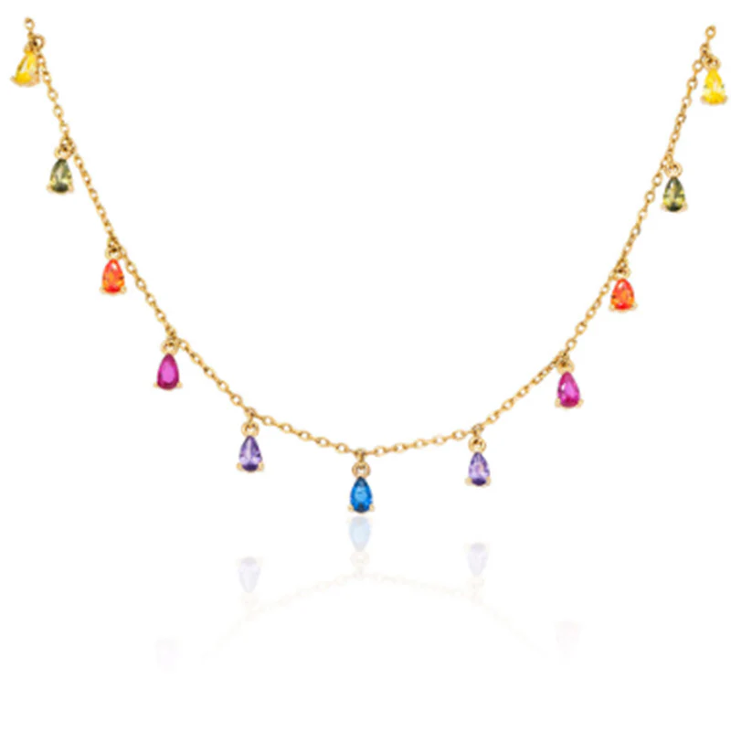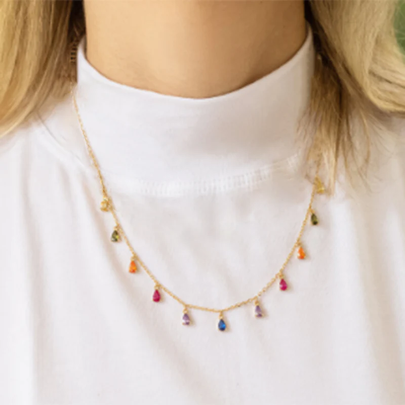Collier en fine chaîne longue avec 11 zircons multicolores.