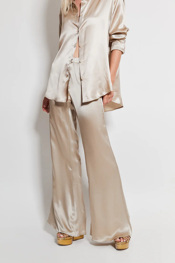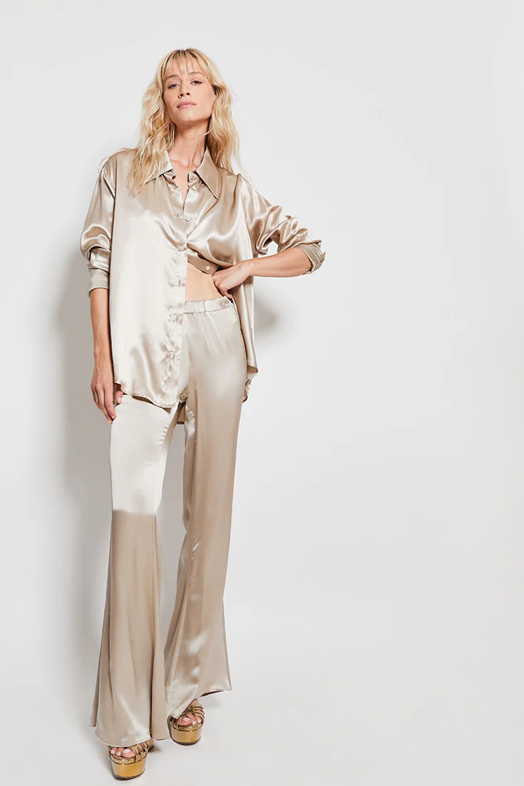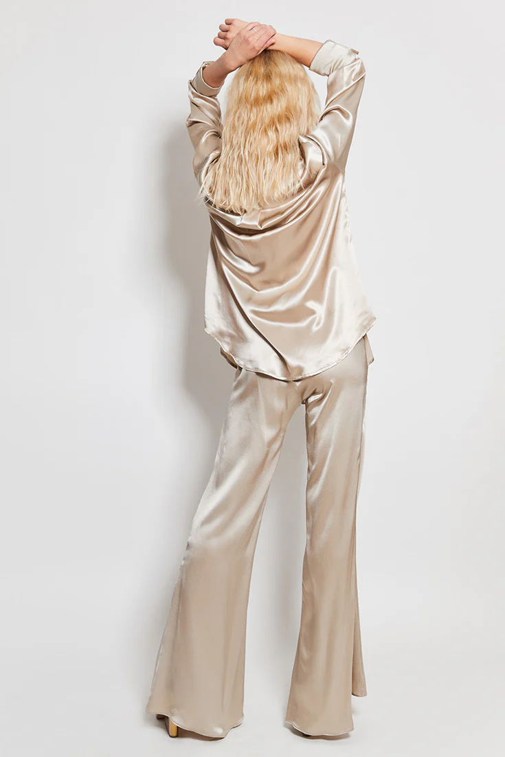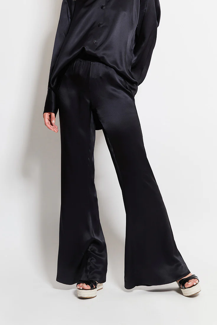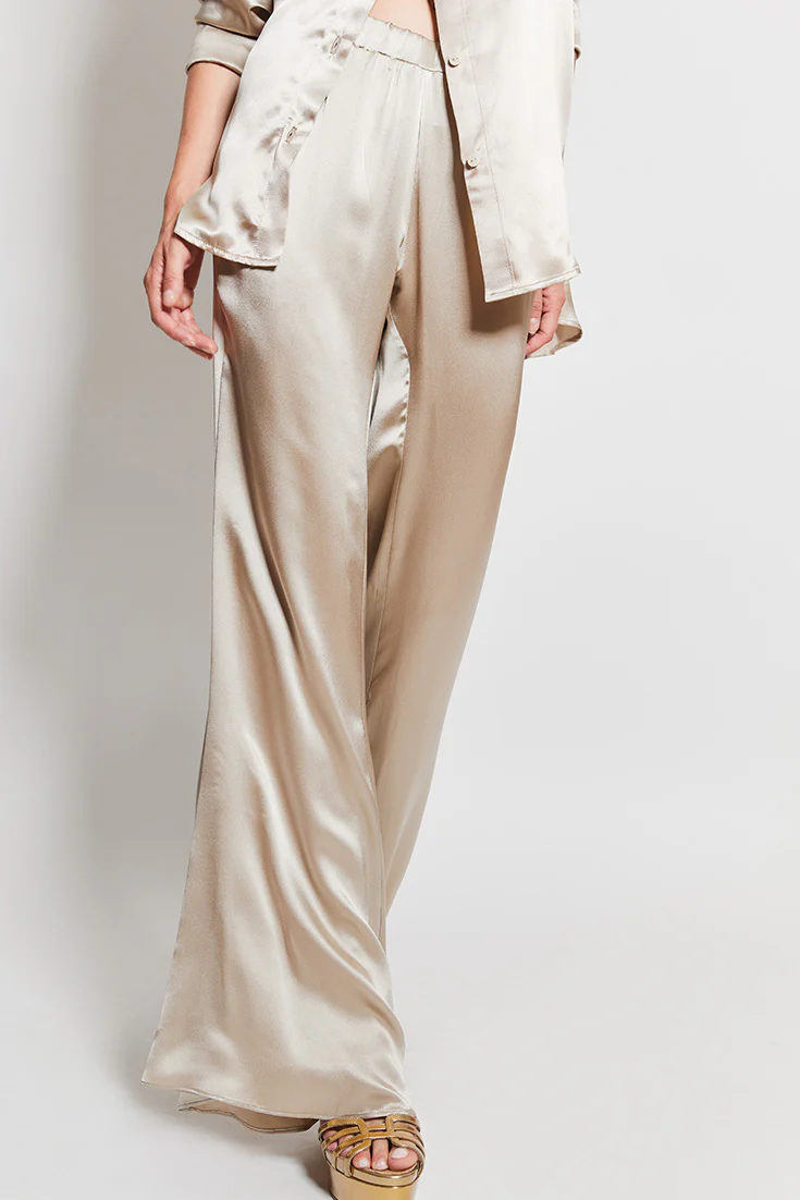 Le pantalon Lois, fluide et léger, est un incontournable pour une garde-robe intemporelle. Confectionné dans un satin soyeux, il vous invite à la douceur et au luxe discret. Ce pantalon évasé est doté d’une taille élastique pour le confort et une silhouette flatteuse. Idéal pour des looks du jour et du soir, il s’associe parfaitement avec des hauts ajustés ou des tuniques amples pour une polyvalence inégalée.