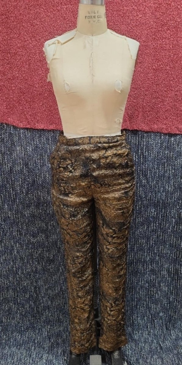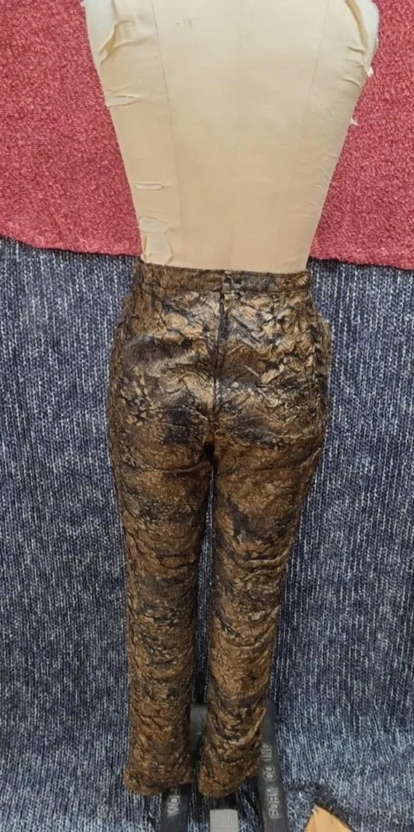 Pantalons taille haute en satin froissé brun et noir. Fermeture éclair et attache invisible au dos. 2 poches. Jambe droite. Doublé en coton.