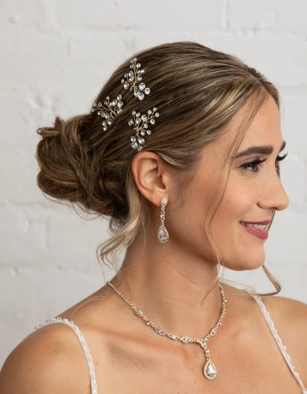 Ajoutez une touche de grâce discrète à votre coiffure avec cet ensemble de trois peignes à cheveux finement travaillés, conçus pour sublimer sans voler la vedette. Chaque pièce allie finesse et légèreté, parfaite pour les mariées en quête d’un style naturel et raffiné.