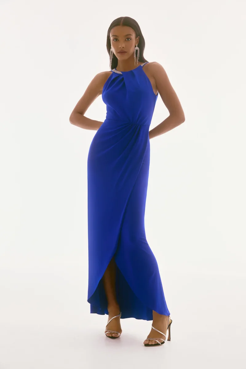 Son encolure licou élégante, délicatement ornée, met en valeur les épaules et le port de tête avec une touche de glamour raffiné. La jupe tulipe drapée, agrémentée de plis savamment placés, crée un mouvement fluide et gracieux à chaque pas.