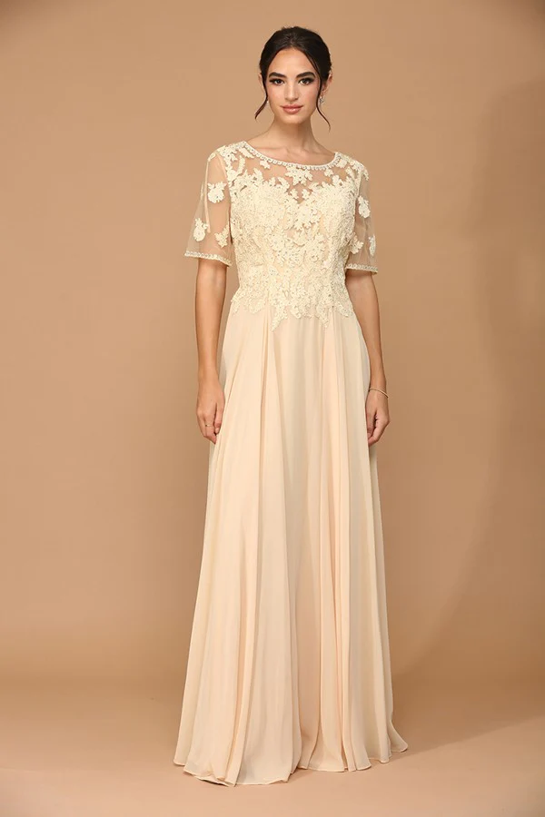 La robe de mère de marié à manches courtes en dentelle est une robe élégante conçue spécialement pour les mères de mariées.