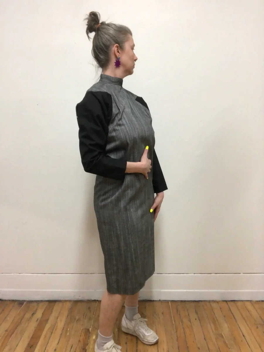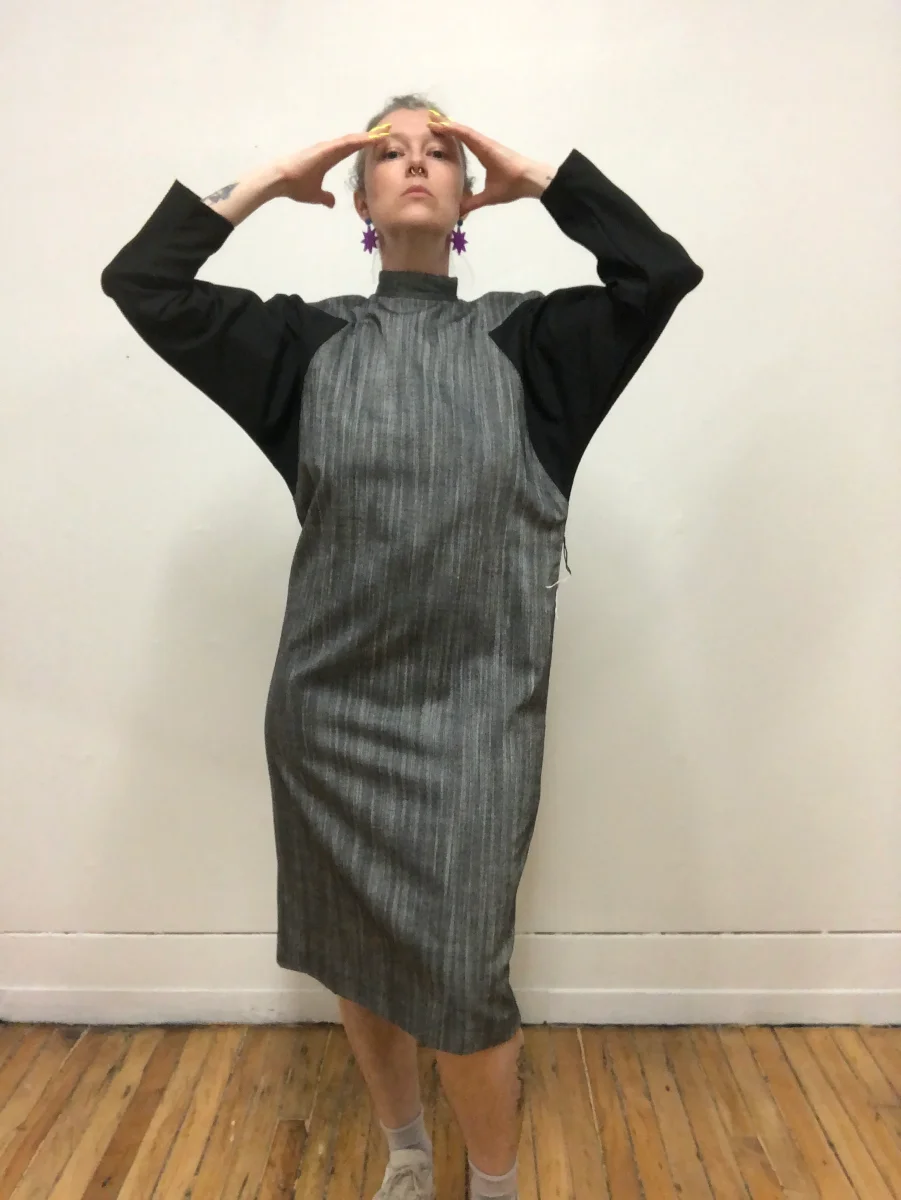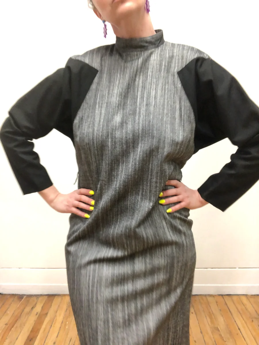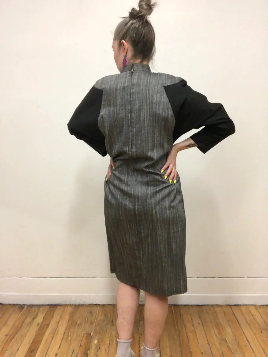 Robe à manche longue en coton gris chambray et noir. Col cheminé. Manche chauve-souris. Fermeture éclair au dos. En tissu épais. Parfaite robe d’automne. En parfait état vintage.