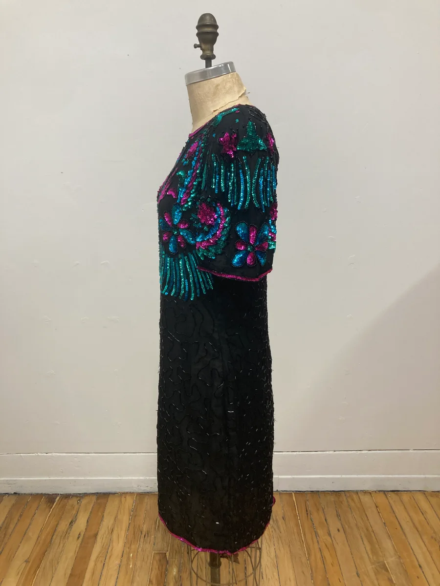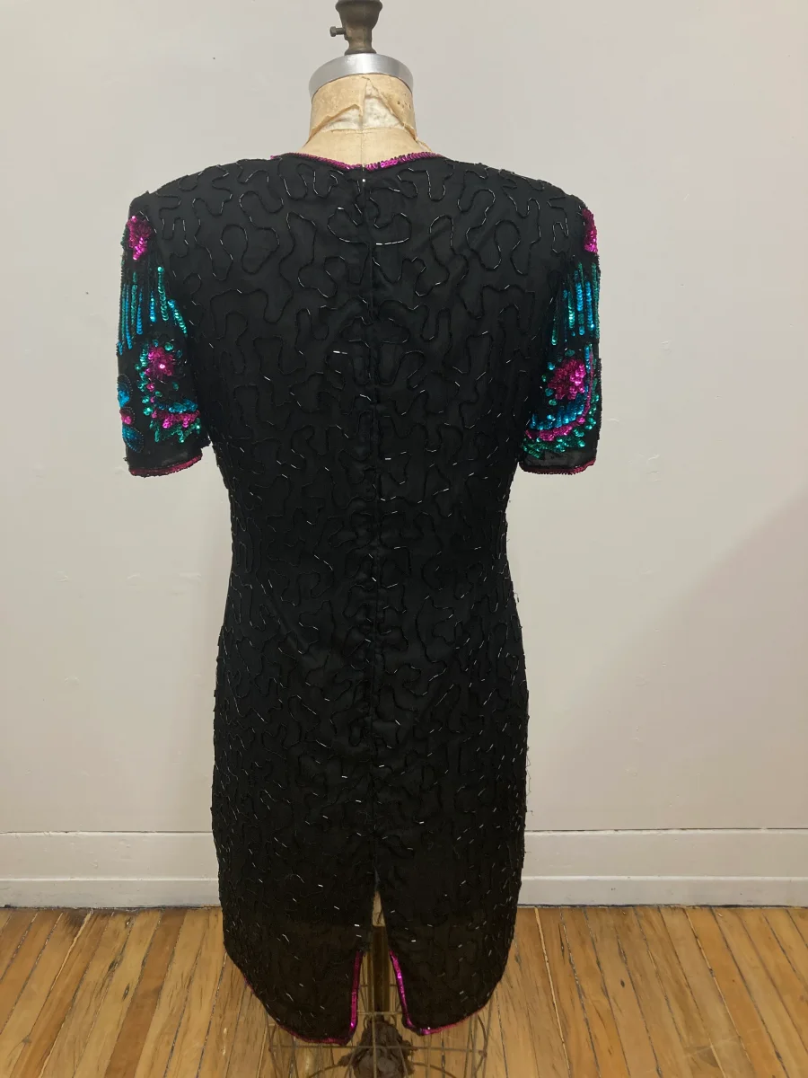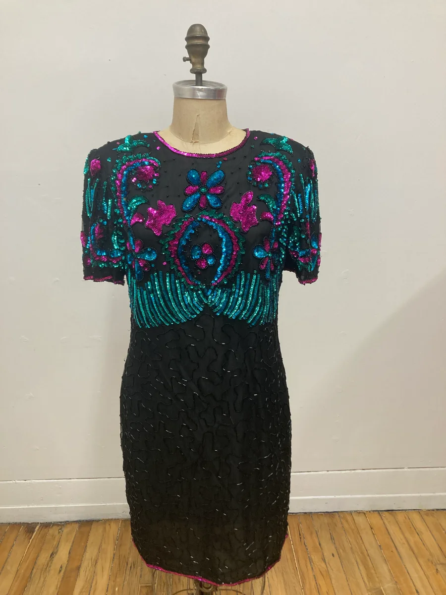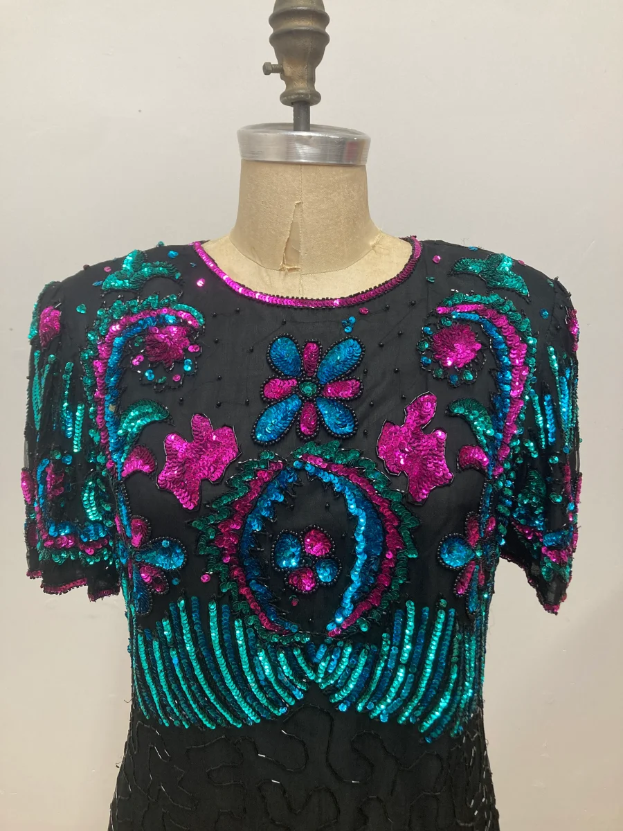 Jolie robe en soie, à manches courtes. Ornée de passementeries noires, turquoises, bleues et fucshia, vous ferez fureur avec cette robe éclatante à paillettes ! De la marque ROYAL FEELINGS vintage. Fermeture éclair au dos, épaulettes.
