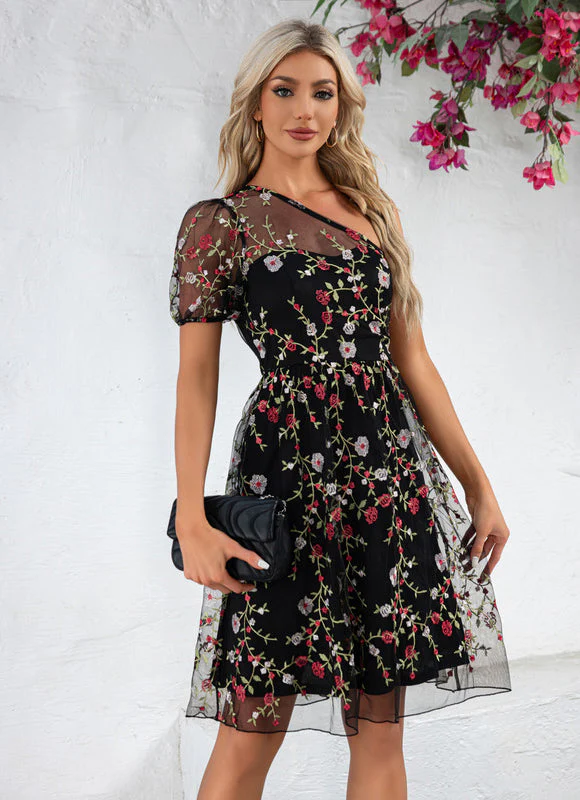 Laissez-vous séduire par notre sublime robe asymétrique aux délicates broderies florales qui se détachent sur un fond noir profond. Son design one-shoulder unique avec superposition de tulle transparent orné de motifs floraux rouges et roses apporte une dimension romantique et légère. Le décolleté asymétrique avec une manche courte transparente et l’autre épaule dénudée crée une silhouette sophistiquée, parfaite pour vos événements printaniers ou estivaux.