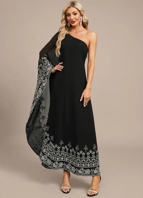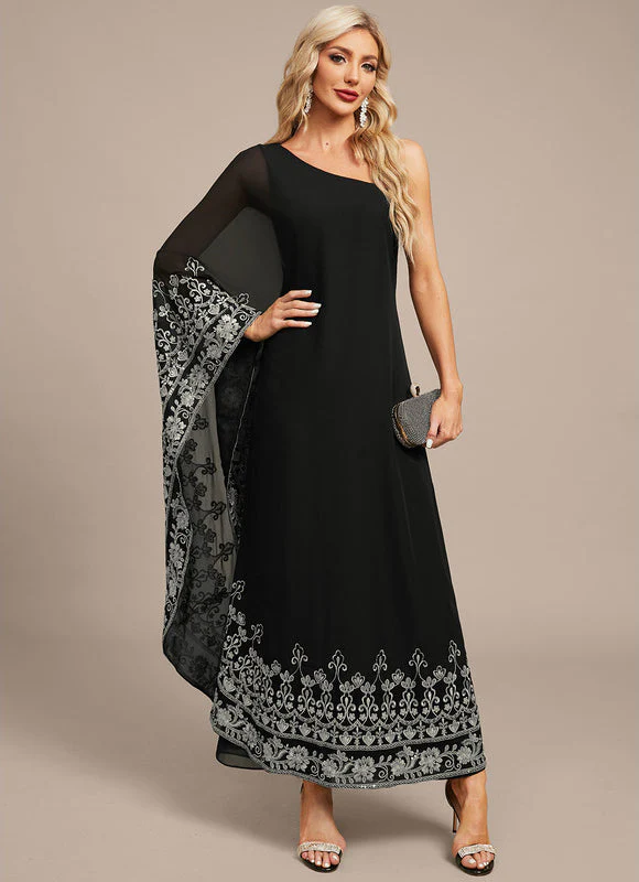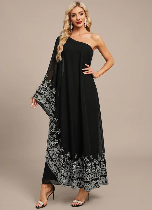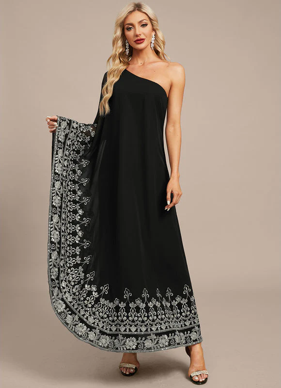 Laissez-vous séduire par cette sublime robe asymétrique noire qui allie élégance et modernité. Son design one-shoulder dévoile gracieusement une épaule tout en habillant l’autre d’une manche ample ornée de broderies argentées. La silhouette évasée de cette robe longue sublime toutes les morphologies tandis que ses finitions argentées apportent une touche de raffinement parfaite pour vos soirées prestigieuses.