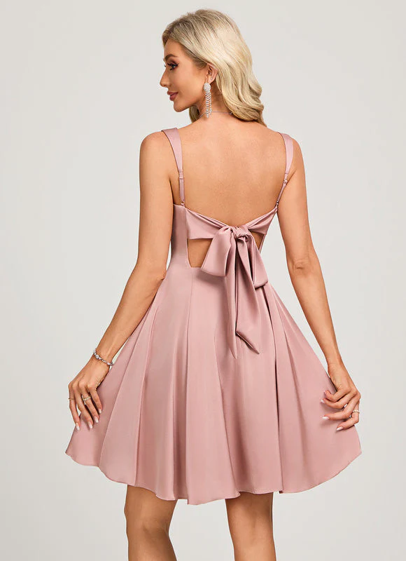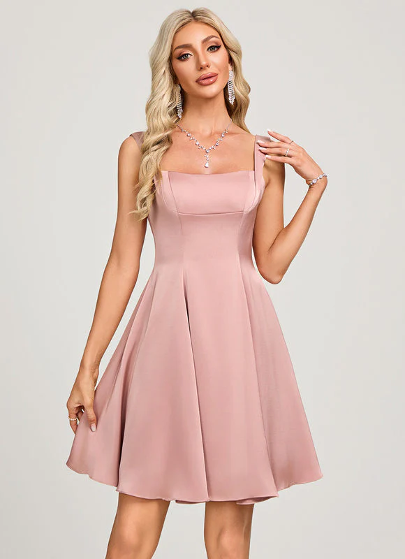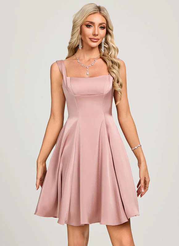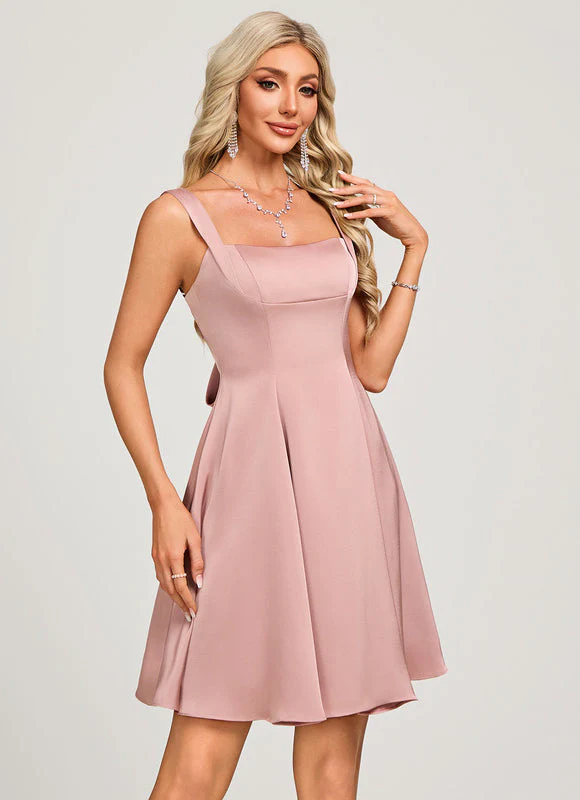 Sublimez votre silhouette avec cette robe patineuse au décolleté carré sophistiqué. Son tissu satiné mat capture délicatement la lumière tandis que son dos ouvert avec nœud apporte une touche romantique. Sa longueur au-dessus du genou et sa coupe évasée offrent liberté de mouvement tout en restant élégante pour toutes vos occasions spéciales.
