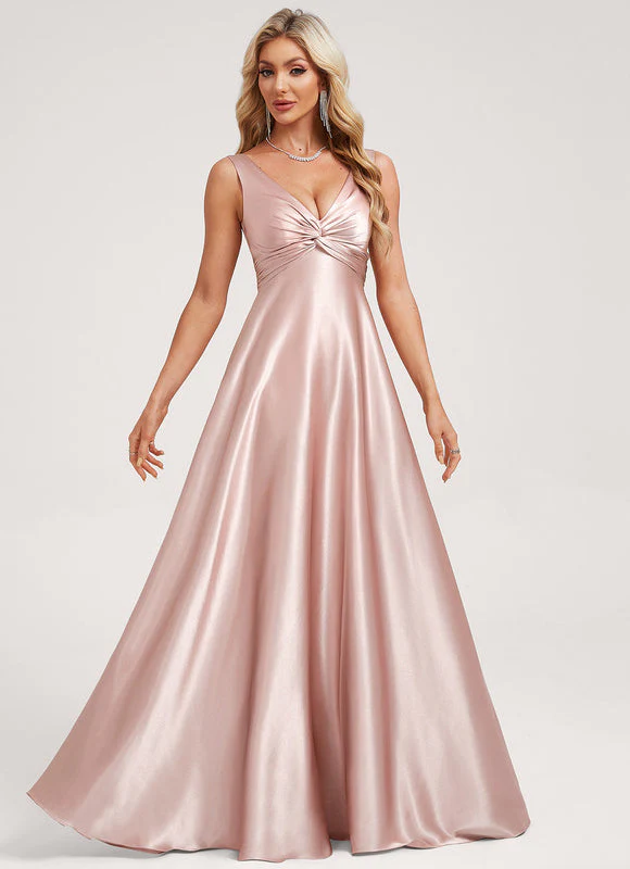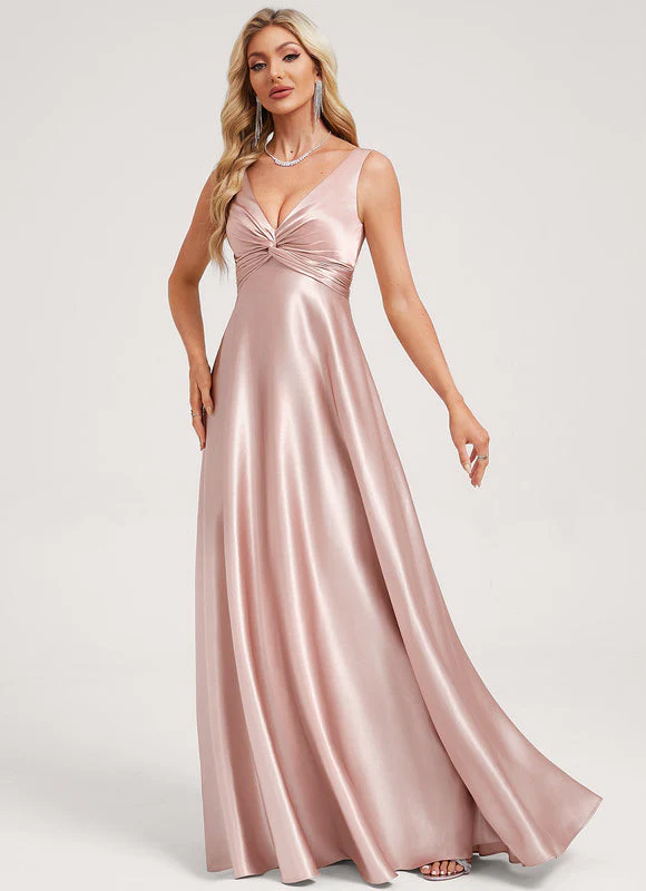 Robe ras du sol en satin extensible, forme trapèze avec col en V et dos zippé. Conçue pour toutes les morphologies avec une large gamme de tailles disponibles.