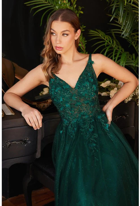 Robe de bal en tulle brillant et bustier en dentelle transparent. Coupe ligne A Prenez note que les ajustements (bas et bustier) sont sans frais et fait en magasin.