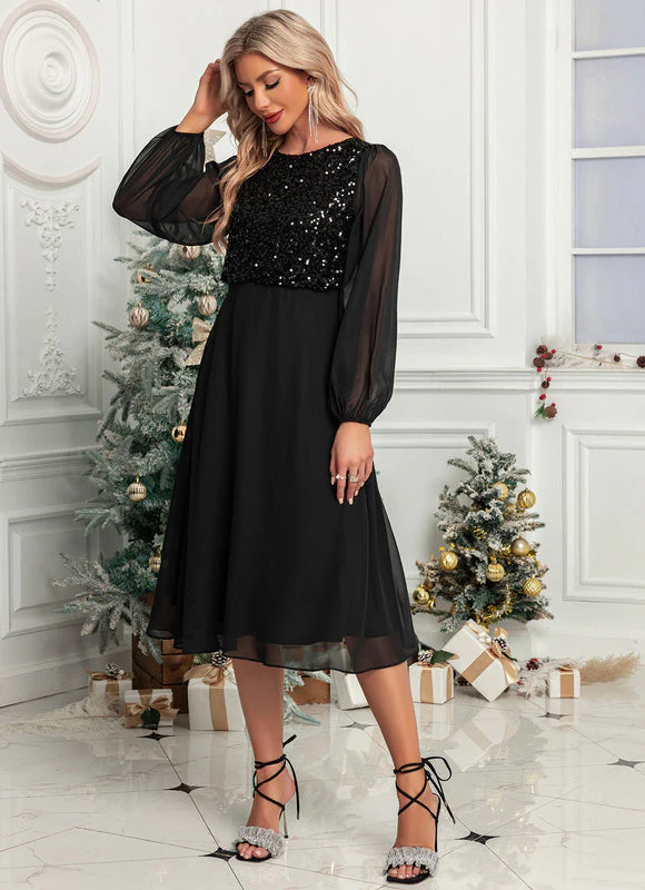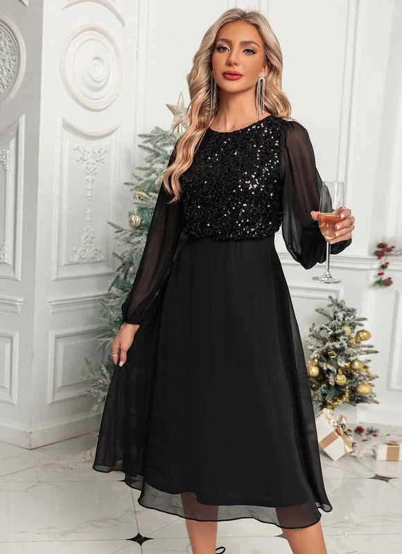 Démarquez-vous avec notre magnifique robe noire alliant un haut scintillant couvert de sequins qui attire tous les regards et des manches transparentes en mousseline ajoutant une touche de légèreté. Sa coupe trapèze mi-longue sublime votre silhouette avec élégance tout en garantissant votre confort pour les longues soirées. La jupe fluide en mousseline virevolte gracieusement à chacun de vos mouvements, parfaite pour toutes vos occasions spéciales.