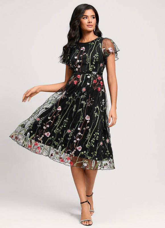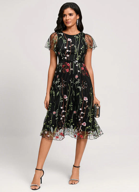 Laissez-vous séduire par cette magnifique robe en tulle noir qui fait sensation à chaque événement. Son design exquis allie l’élégance d’une coupe midi évasée avec la légèreté du tulle brodé de motifs floraux délicats. Les broderies multicolores se détachent parfaitement sur le fond noir, créant un contraste saisissant qui capte tous les regards. Ses manches courtes transparentes apportent une touche de fraîcheur, tandis que la ceinture fine met en valeur votre silhouette avec grâce.