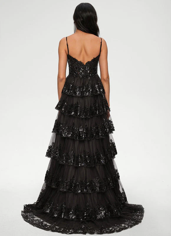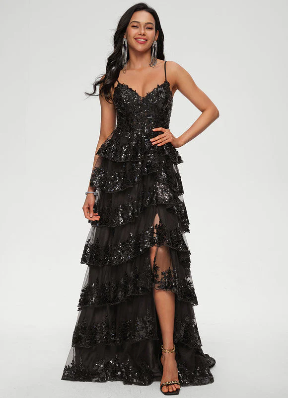 Illuminez votre soirée avec notre sublime robe de bal qui captivera tous les regards. Sa silhouette glamour se distingue par ses multiples volants ornés de paillettes créant un effet cascade spectaculaire. Le décolleté en V bordé de dentelle met en valeur votre buste, tandis que la fente latérale révèle subtilement votre jambe pour une allure captivante. Les détails pailletés reflètent la lumière à chacun de vos mouvements, créant une aura magique autour de vous.