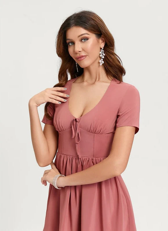 Laissez-vous séduire par la fluidité de notre robe de bal ado en mousseline. Sa coupe trapèze flatte toutes les silhouettes, créant une allure gracieuse et aérienne. Le délicat col V met en valeur votre décolleté avec subtilité, tandis que le charmant nœud à l’avant ajoute une touche de romantisme et de fantaisie. Sa longueur courte est parfaite pour montrer vos jambes et vous permettre de bouger avec aisance, que ce soit pour danser ou simplement pour vous déplacer avec élégance. Entièrement doublée, elle assure un confort impeccable et une tenue parfaite tout au long de votre événement.