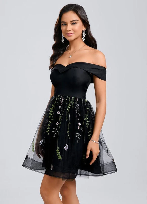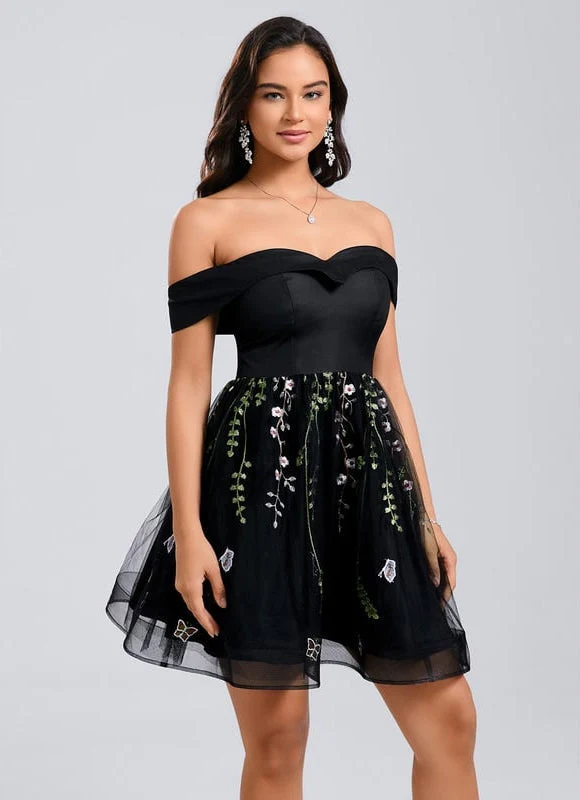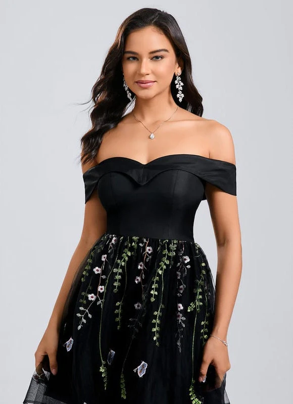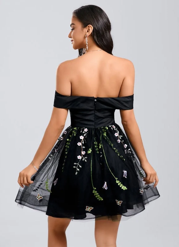 Éblouissez avec notre Robe De Bal Brodée Noire Courte Épaule Dénudée