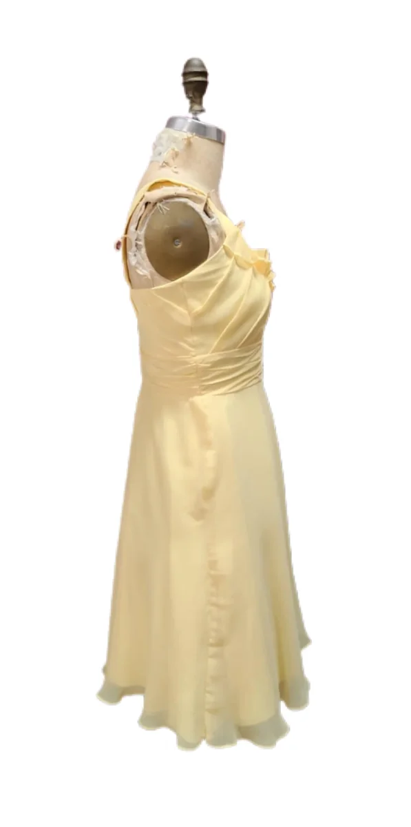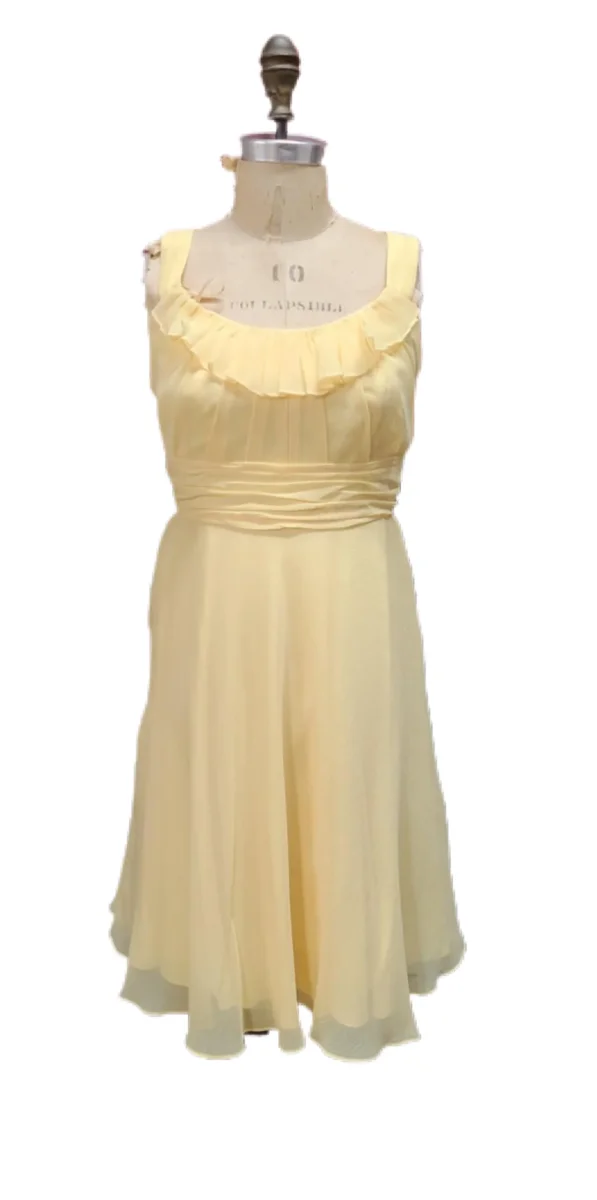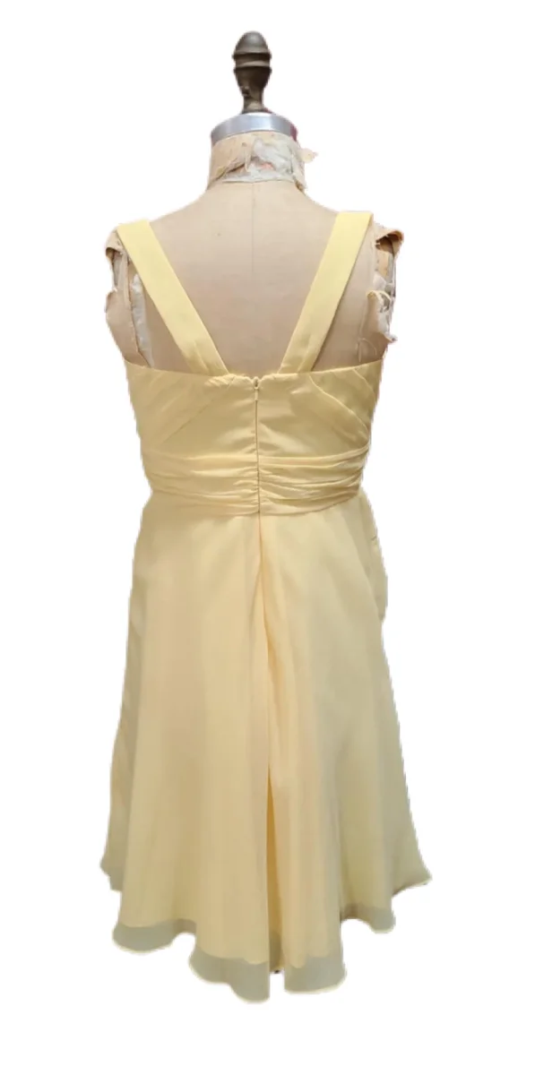 De la marque DAVID’S BRIDAL. Robe courte à bretelles, en tulle jaune pâle. Cintrée à la taille. Encolure ronde. Fermeture éclair au dos.