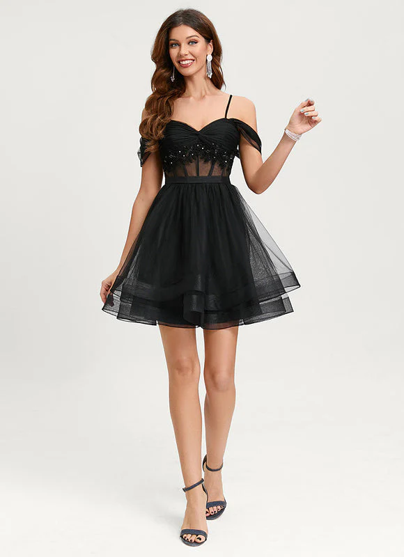Laissez-vous séduire par cette somptueuse robe de bal en tulle noir alliant sophistication et sensualité. Son corsage transparent décoré de paillettes scintillantes attire tous les regards, tandis que sa jupe multicouche en tulle crée un mouvement aérien et gracieux. Cette robe courte au-dessus du genou met en valeur votre silhouette avec son col cœur subtilement décolleté et son style off-shoulder aux fines bretelles.