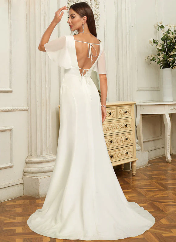 Cette magnifique robe de mariée avec fente incarne la parfaite alliance entre tradition et modernité. Confectionnée dans une mousseline fluide et délicate, elle épouse harmonieusement vos courbes grâce à sa coupe sirène qui met en valeur votre silhouette. Le décolleté en V plongeant apporte une touche de sensualité raffinée, tandis que les manches courtes évasées ajoutent une dimension romantique à l’ensemble. Cette robe longue au dos en V créé un effet spectaculaire qui ne manquera pas de faire sensation lors de votre entrée dans l’église. La fente latérale révèle subtilement votre jambe à chaque pas, créant un mouvement élégant qui vous permettra de danser avec aisance toute la soirée.