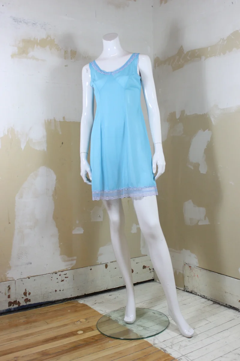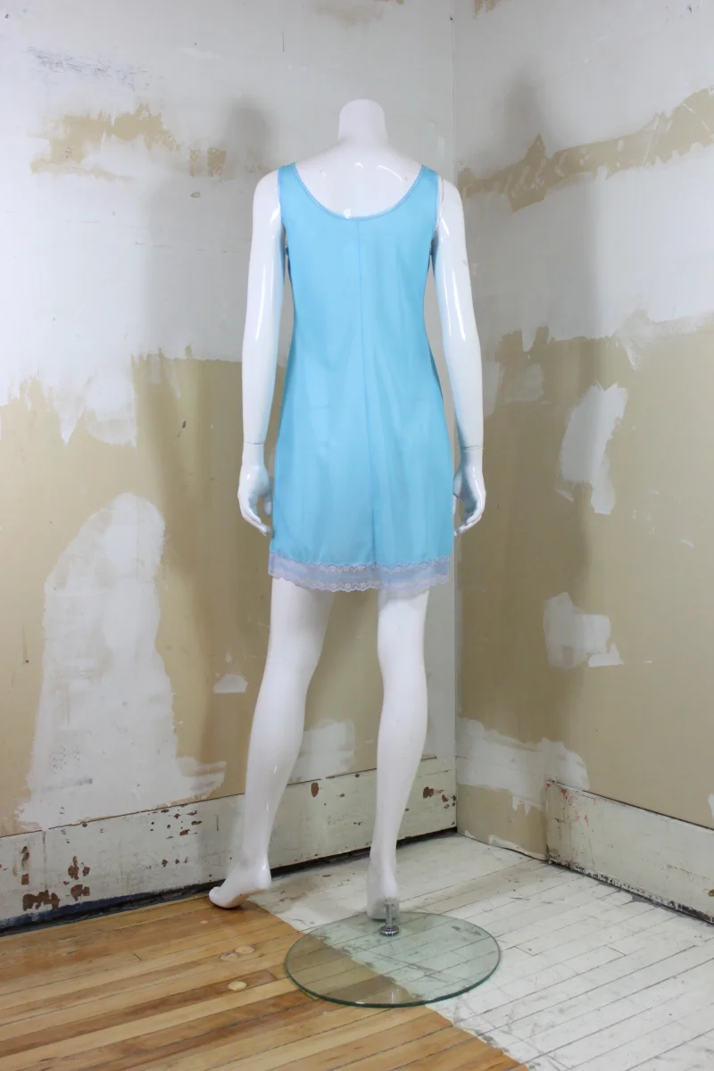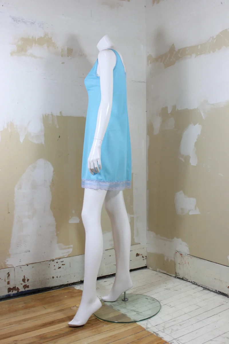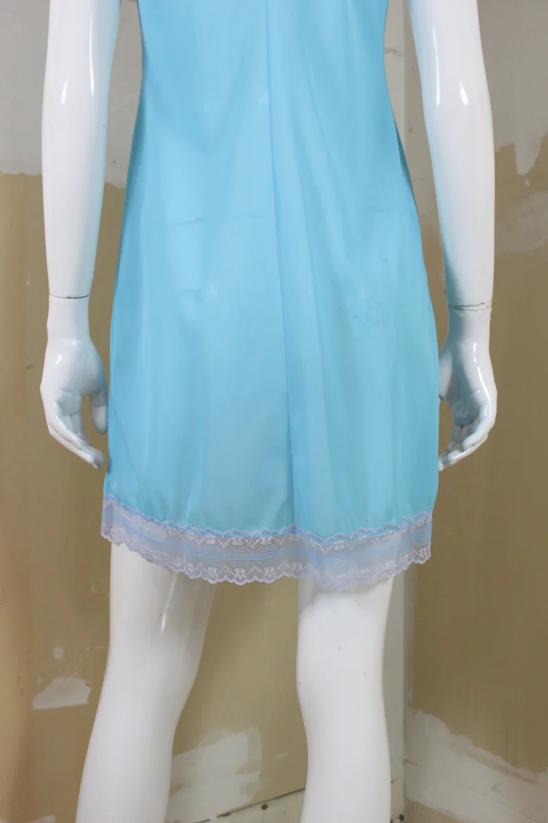 Jolie robe de nuit bleu ciel, de la marque DELFION, vintage. Légèrement transparente. Ornée de dentelle grise et bleue au niveau du décolleté et au bas.