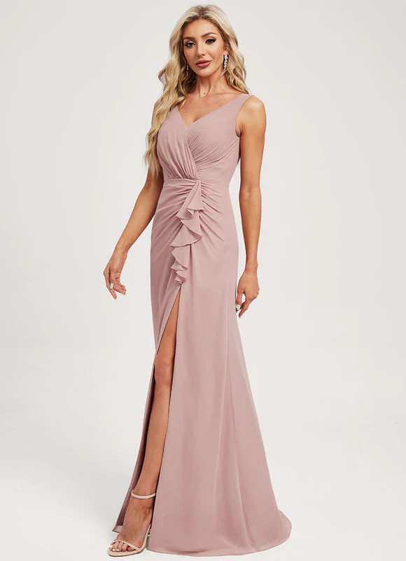 Notre robe fluide rose poudré allie élégance et féminité avec brio. Sa coupe met en valeur votre silhouette grâce au décolleté en V et au drapé latéral avec volants. La fente élégante dévoile subtilement votre jambe pour un effet glamour. Confectionnée en mousseline légère de qualité supérieure, cette robe vous garantit un confort absolu tout au long de vos événements.