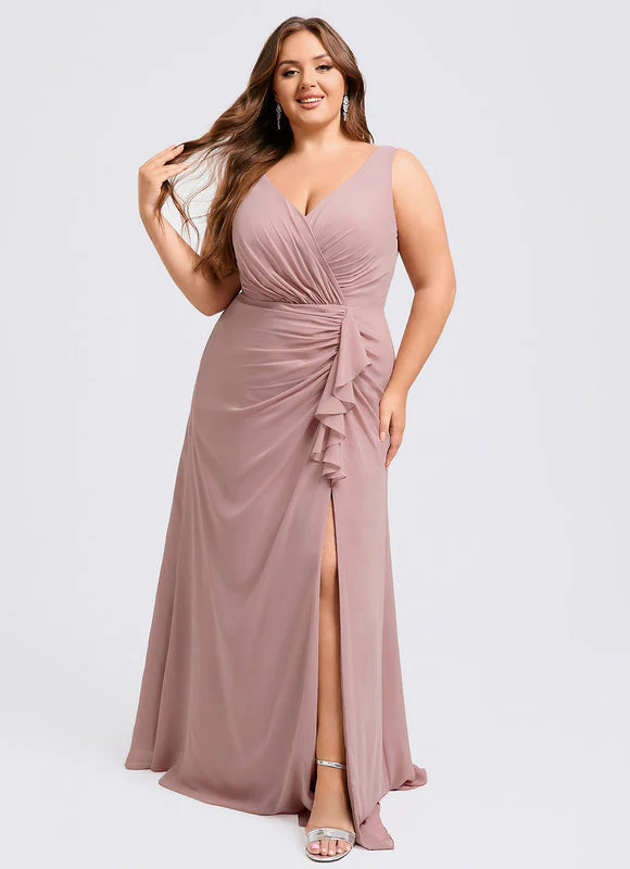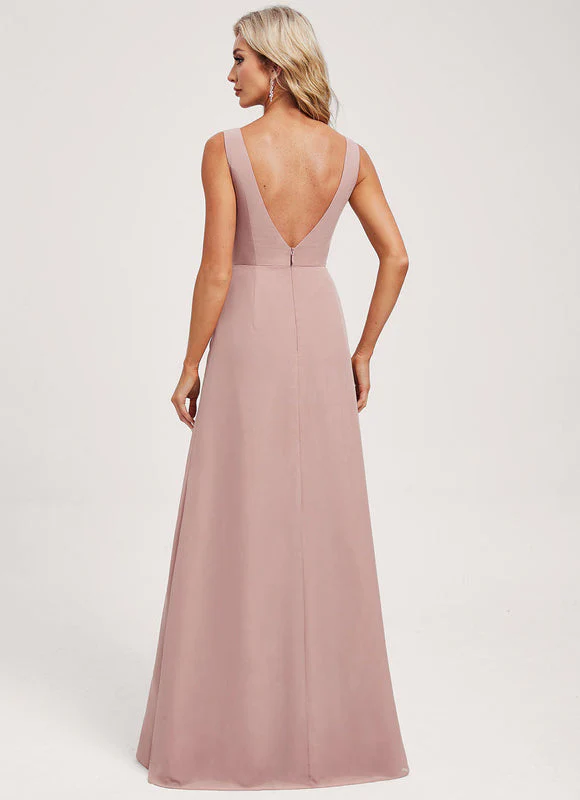 Confectionnée en mousseline fluide avec forme trapèze, cette robe longueur ras du sol présente un décolleté en V, un dos en V avec zip arrière, et des détails raffinés comme les volants décoratifs.