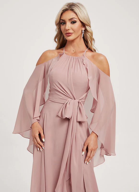 Cette robe fluide en rose poudré allie élégance et confort pour toutes vos occasions spéciales. Son design innovant offre deux styles en un : une version classique à col licou et une version sophistiquée avec manches cape flottantes qui apportent mouvement à votre silhouette. La ceinture drapée à nouer accentue la taille tandis que la fente latérale dévoile subtilement vos jambes. Sa teinte douce et féminine se marie parfaitement avec des accessoires dorés ou argentés pour un look complet d’invitée.