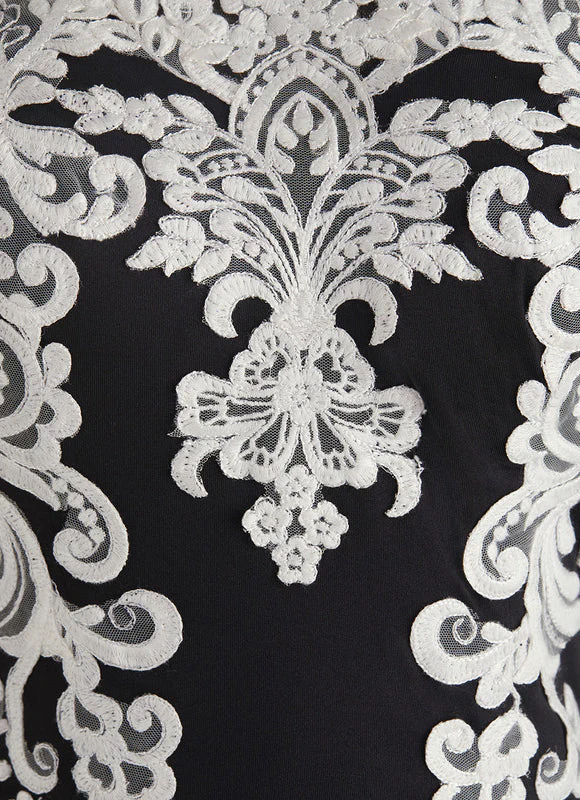 Laissez-vous séduire par cette robe fourreau noire rehaussée de délicates broderies blanches. Sa coupe près du corps met admirablement en valeur votre silhouette, tandis que le dos transparent avec ses motifs floraux sophistiqués crée un contraste saisissant. Cette création exclusive allie l’élégance intemporelle du noir à la finesse des détails pour vous faire remarquer lors de vos événements prestigieux.