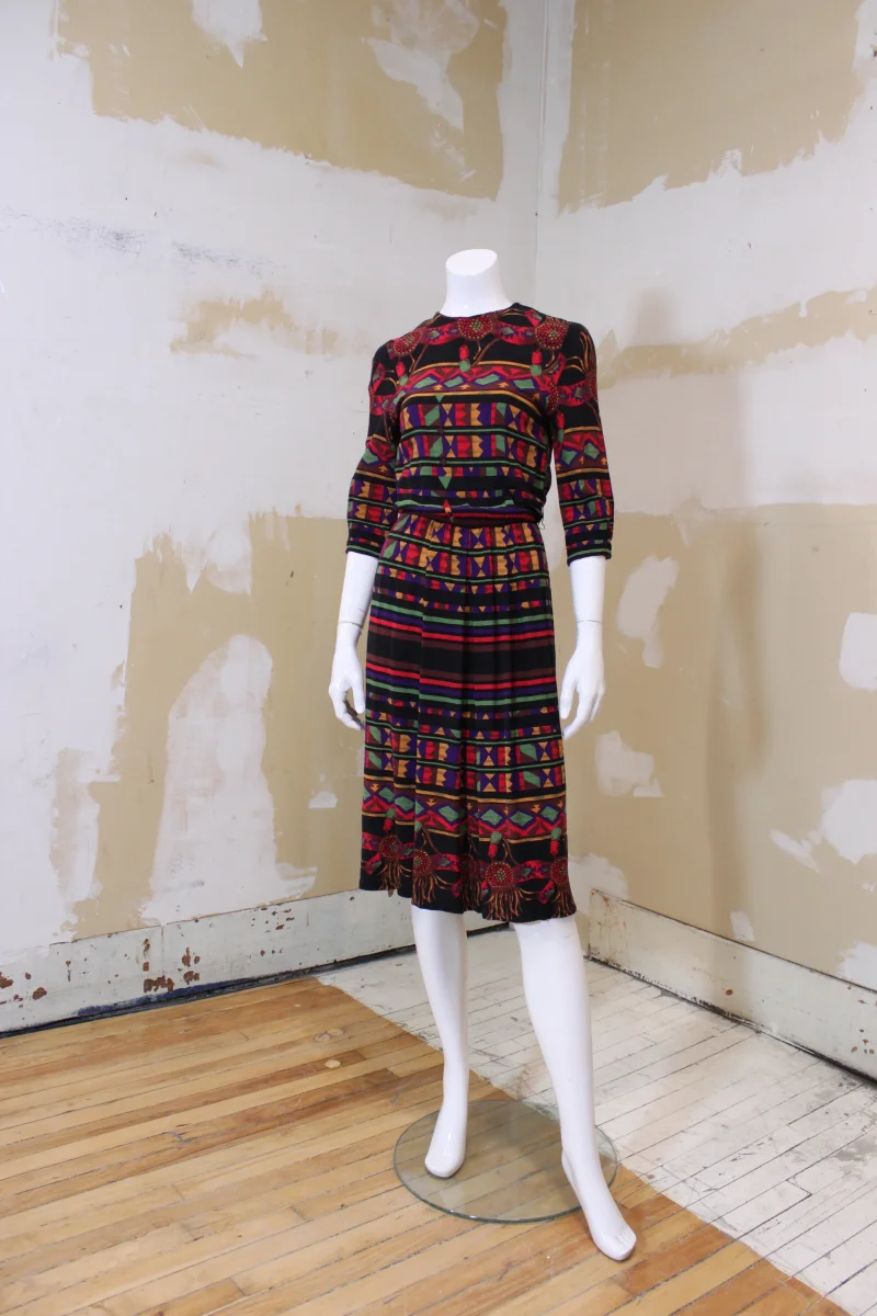 Robe mi-longue, à manches 3/4, de la marque LESLIE BELLE, vintage. Encolure ronde, près du cou, s’attachant avec un bouton au dos. Taille cintrée, élastique. En tissu léger, légèrement texturé. Bandes colorées à motifs géométriques sur fond noir. Grandeur: 9/10 (Fit XS) Épaules : 14 1/2 po. Poitrine: 30 po. taille: 22 po. Hanches: 32 […]