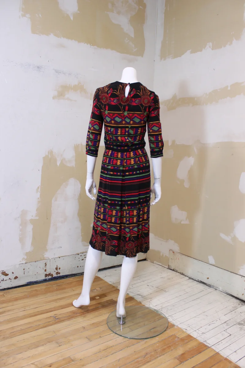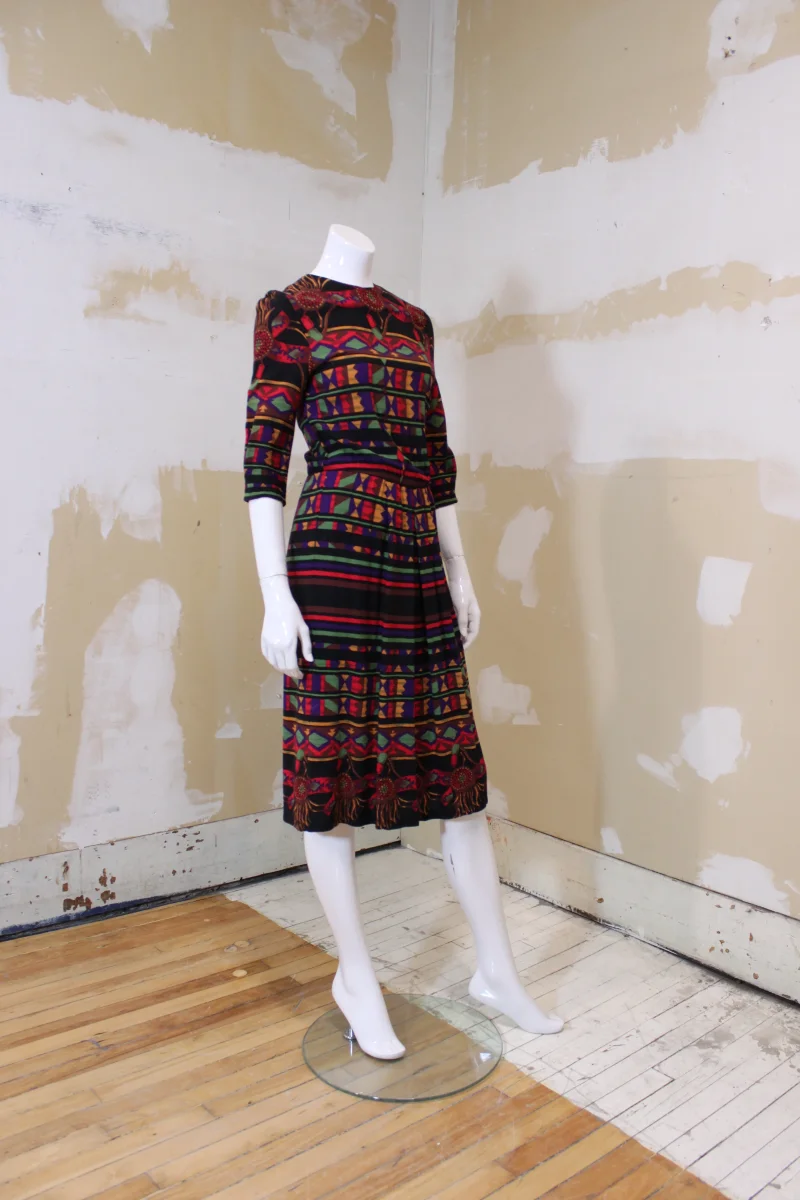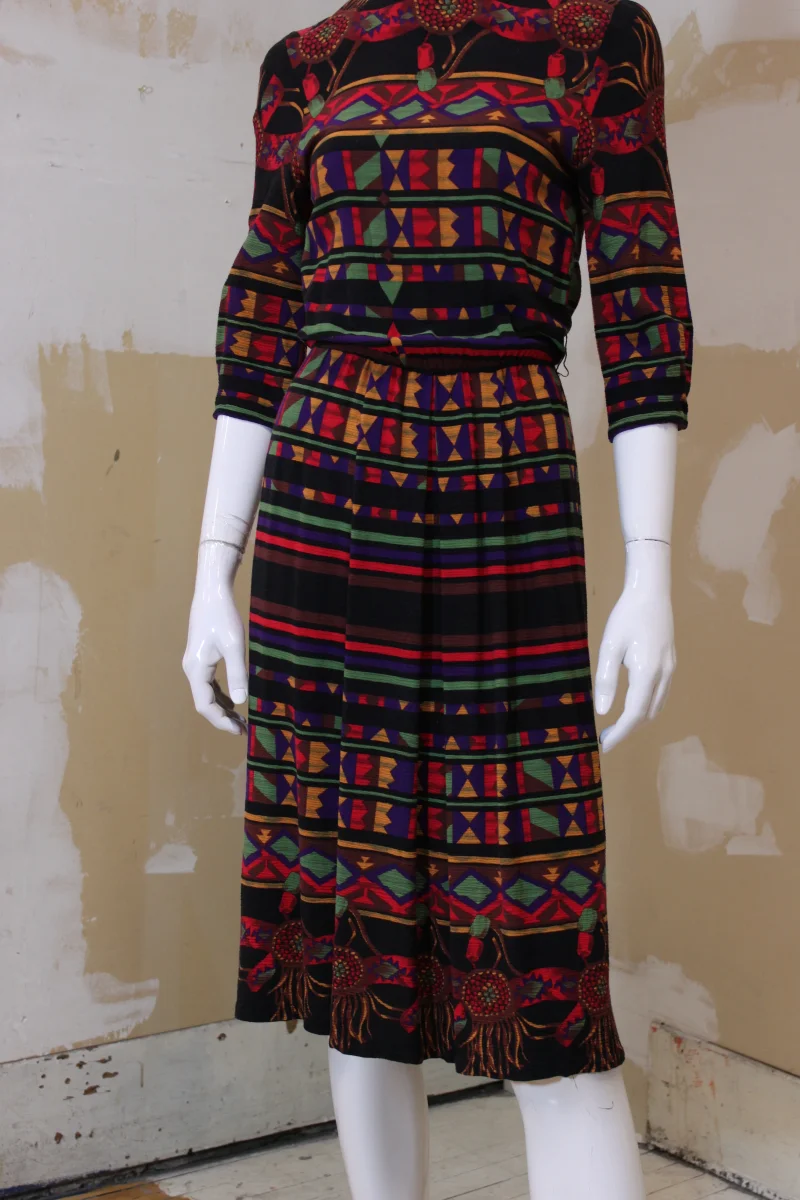 Robe mi-longue, à manches 3/4, de la marque LESLIE BELLE, vintage. Encolure ronde, près du cou, s’attachant avec un bouton au dos. Taille cintrée, élastique. En tissu léger, légèrement texturé. Bandes colorées à motifs géométriques sur fond noir.