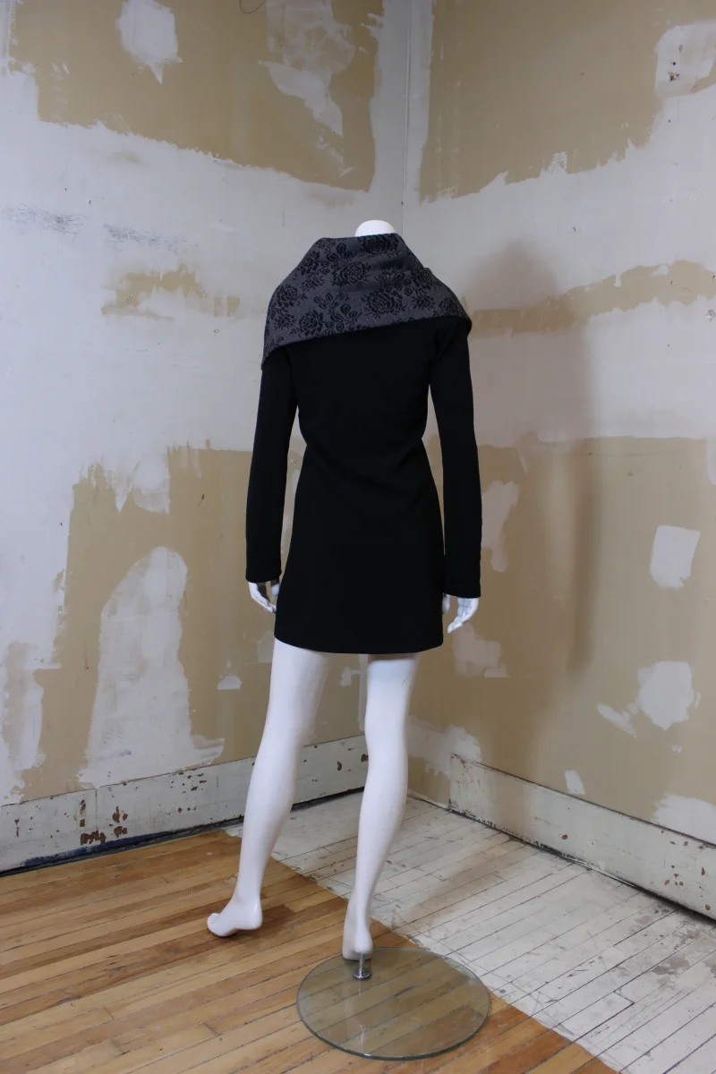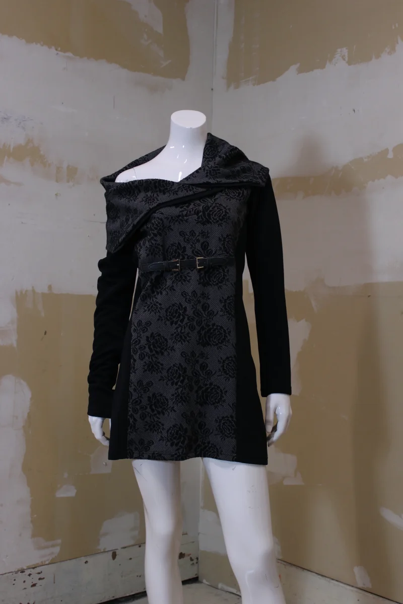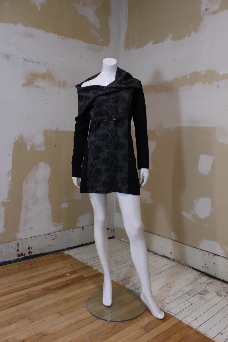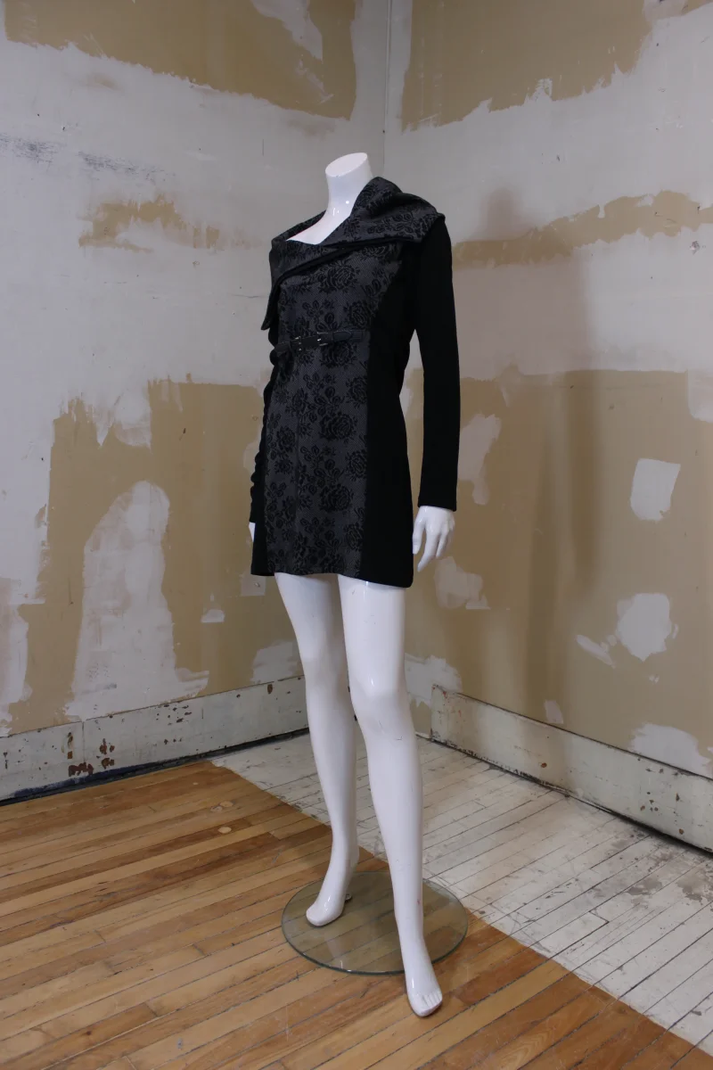 De la marque québécoise RUELLE. À large col, ceinture décorative à la taille. Motifs gris fleuri et noire.
