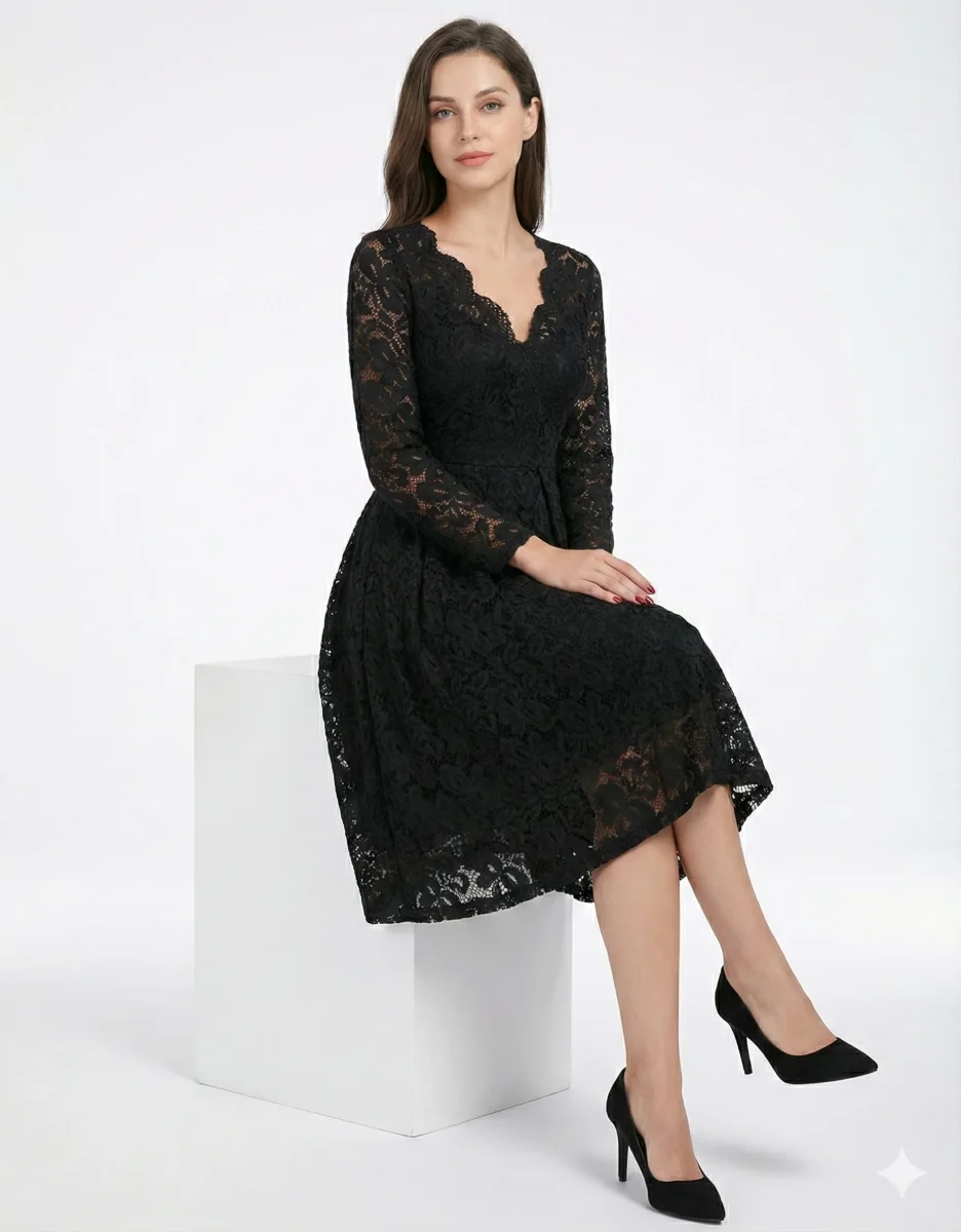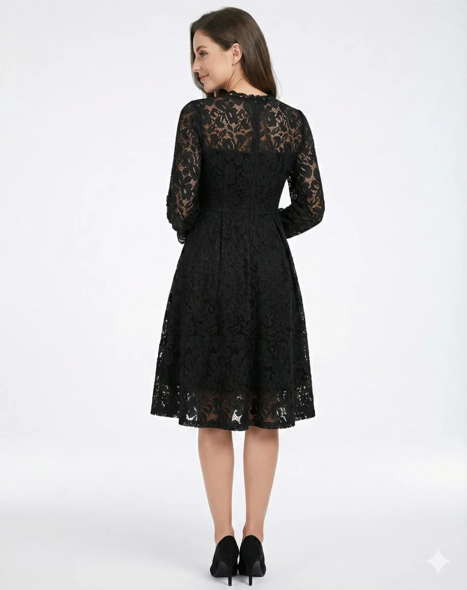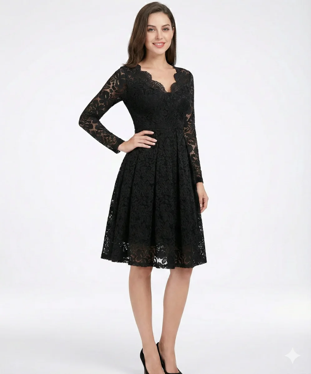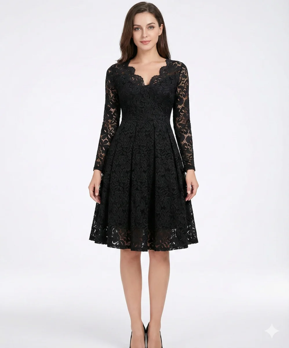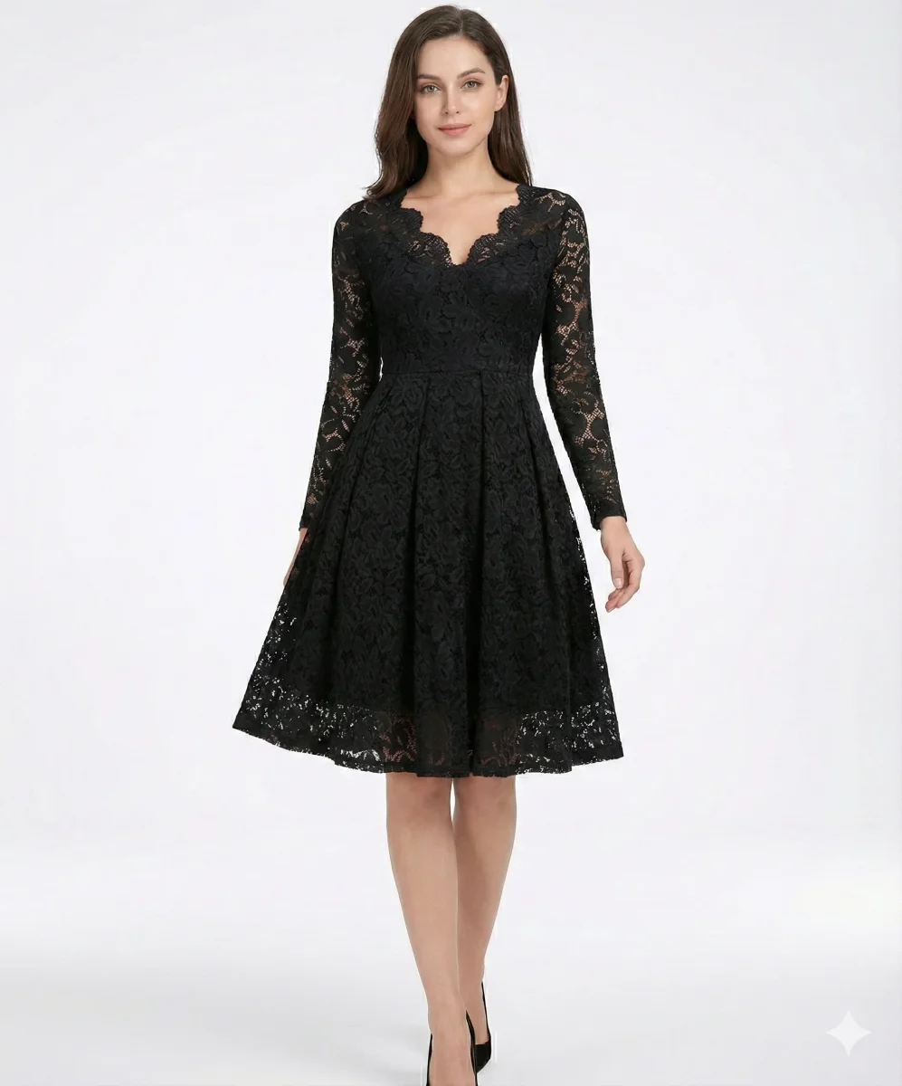 Cette robe noire sophistiquée sublimera votre silhouette pour toutes vos occasions spéciales. Son corsage orné de dentelle florale et ses délicates paillettes capturent la lumière à chaque mouvement. La partie transparente au décolleté apporte une touche de sensualité raffinée, tandis que les manches longues en dentelle créent un contraste saisissant avec la jupe évasée en mousseline qui virevolte gracieusement jusqu’aux genoux, offrant une fluidité exceptionnelle avec sa fermeture invisible au dos.