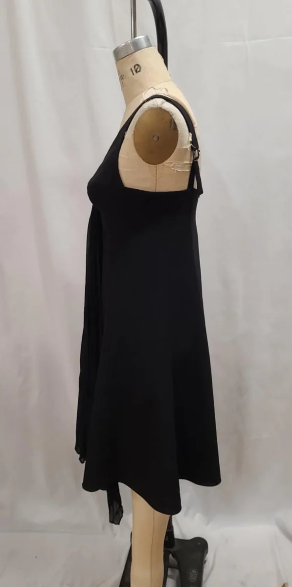 Robe courte, ligne A. Bretelles ajustables. Décolletée avec empiècement de tissu plissé au devant. Cintré sous la poitrine. Fermeture éclair au dos. De la designer québécoise MARIE SAINT-PIERRE.