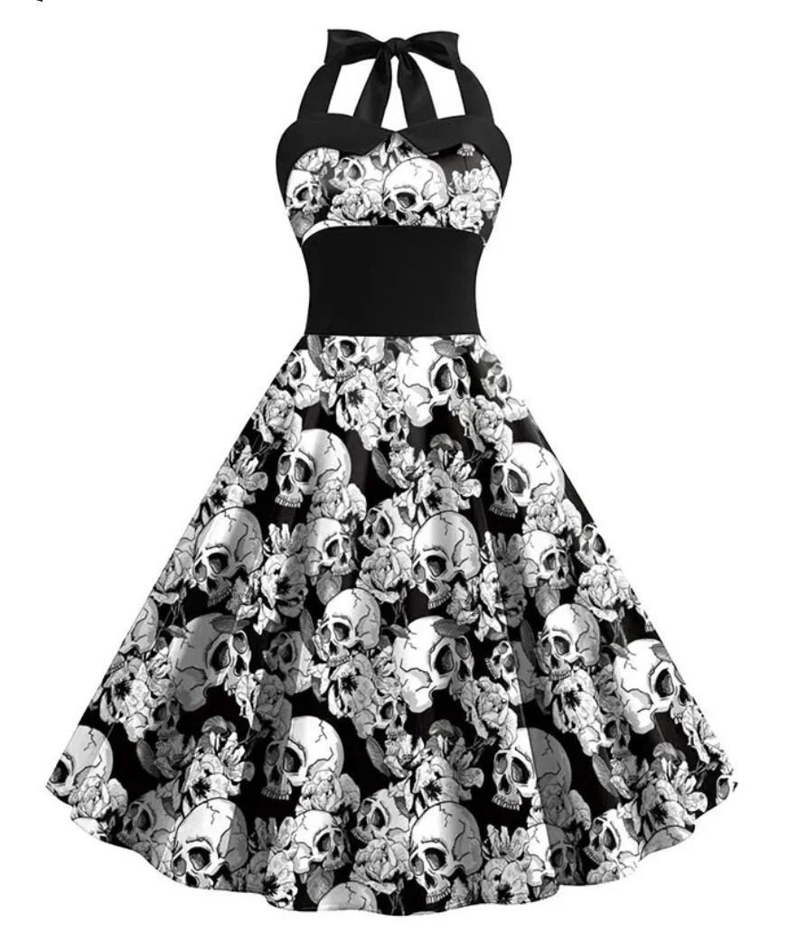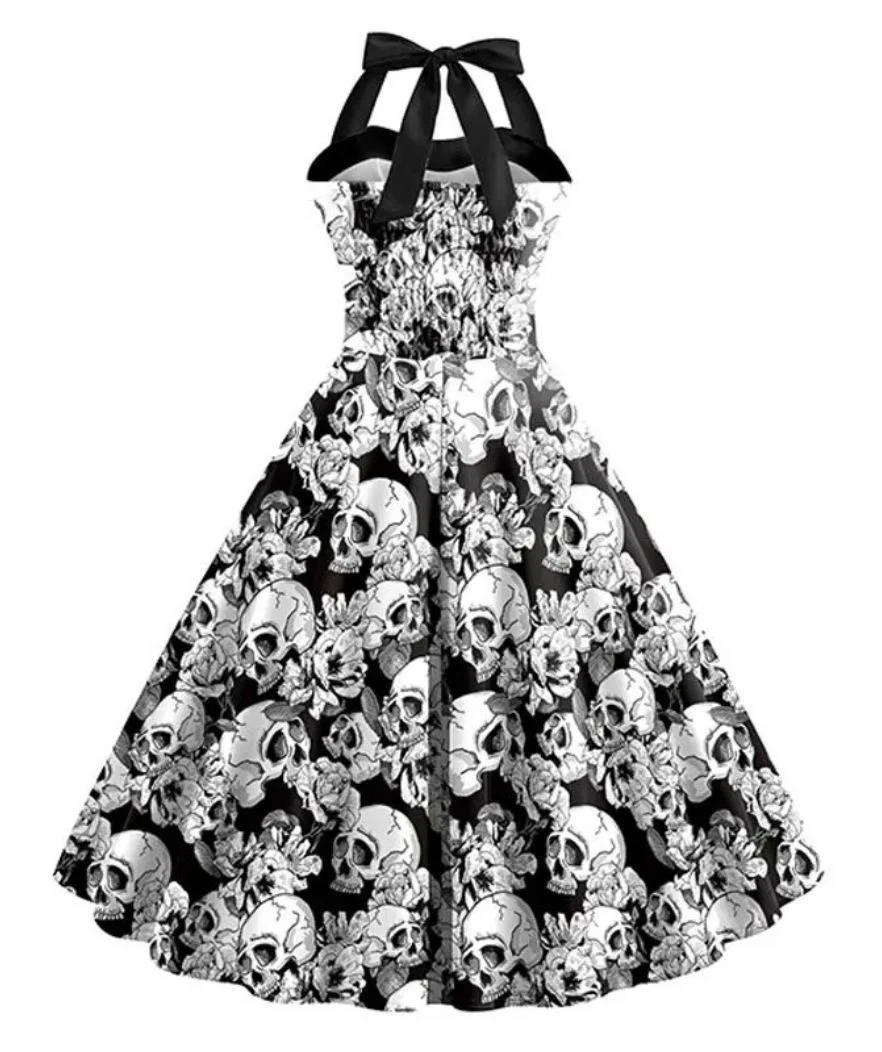 Dans le style mystérieux et qui vient casser les looks traditionnels de l’époque mais en conservant la coupe typique des années 50, cette robe rockabilly tête de mort rend hommage au style dansant et rural des États-Unis de l’époque ! Si vous avez une soirée Rock’n’Roll de prévu, vous pouvez exprimer votre soif de liberté en arborant cette robe avec un bustier resserré qui met en valeur votre silhouette toute entière !