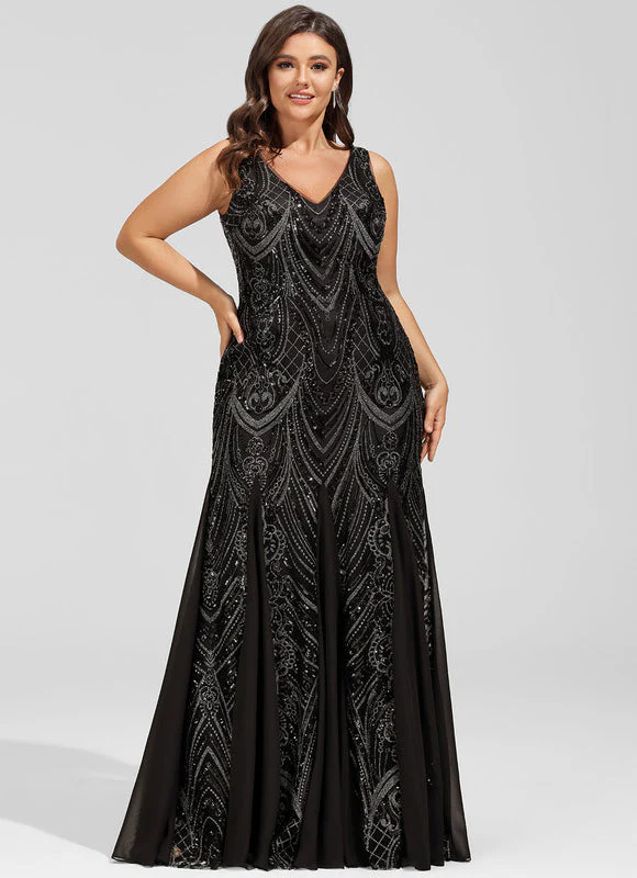 Captivez tous les regards avec notre somptueuse robe sirène noire ornée de motifs géométriques étincelants en sequins argentés. Cette création d’exception épouse parfaitement les courbes féminines grâce à sa coupe ajustée qui s’évase délicatement au niveau des genoux. Le décolleté en V profond met en valeur votre buste, tandis que les motifs Art déco créent un jeu de lumière fascinant à chacun de vos mouvements. Les panneaux de mousseline fluide intégrés dans la partie inférieure vous permettent de vous déplacer avec grâce tout en conservant cette silhouette sirène si désirable.
