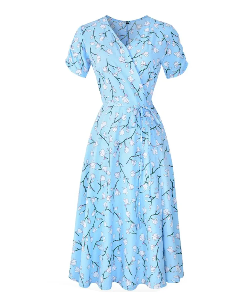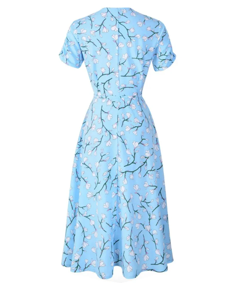 Cette robe année 60 longue de couleur bleue à fleurs est semblable au grand amour.