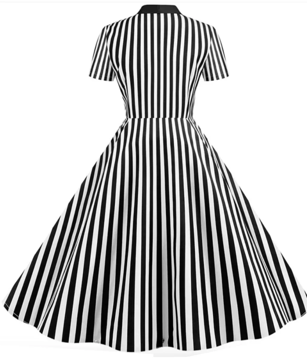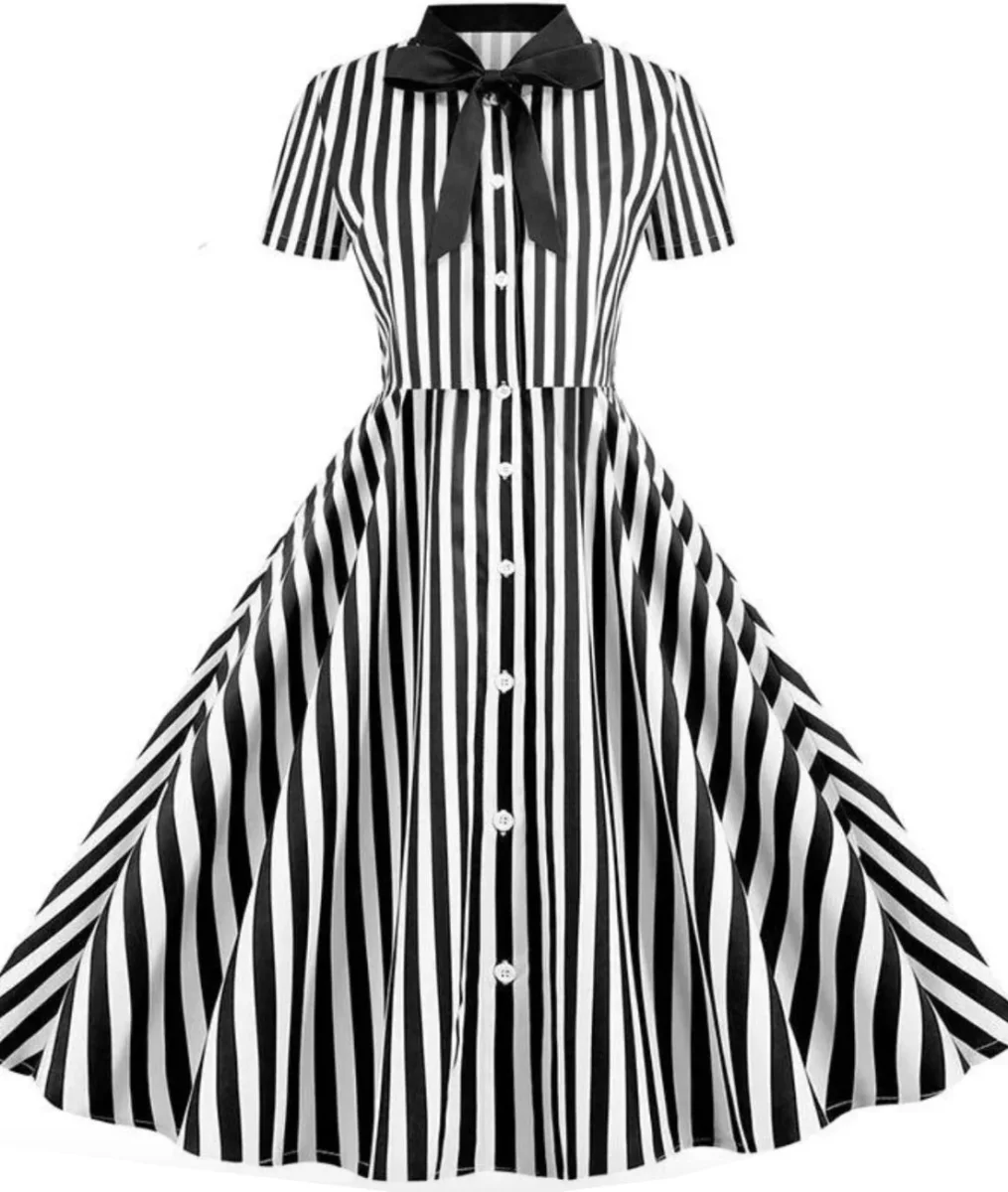 Envolez-vous vers n’importe quelle soirée vintage et fantaisiste tout en arborant du style grâce à la robe à lacets papillon noir et blanc à boutons !