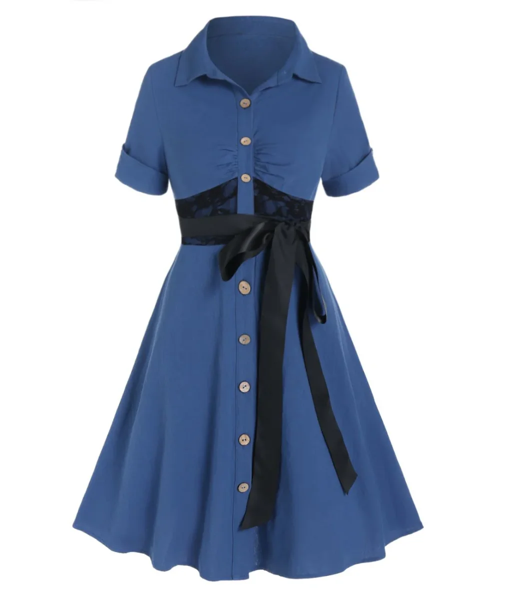 Le col style chemisier est boutonné, ce qui ajoute une touche vintage à la robe, offrant une allure assez raffinée qui souligne le charme de l’époque année 40. Les boutons sont minutieusement attachés de haut en bas de la ligne centrale. Une ceinture noire style ruban vient définir la taille, ce qui apporte une belle touche de finition à votre silhouette en offrant un contraste très élégant. Le corset imprimé en dentelle noire apporte un aspect sensuel.