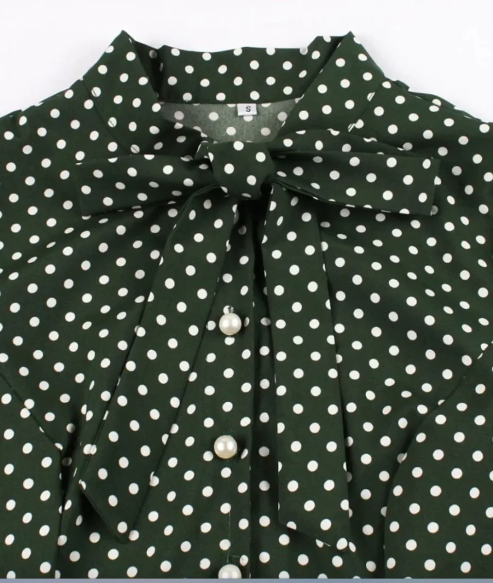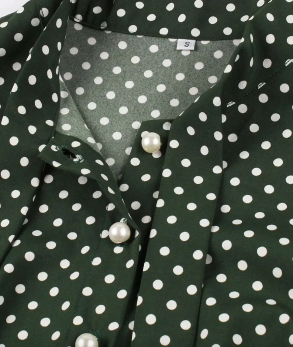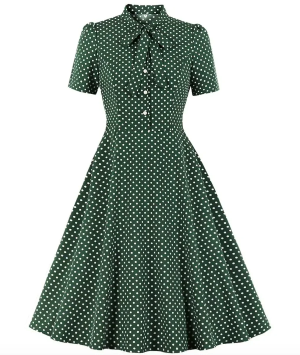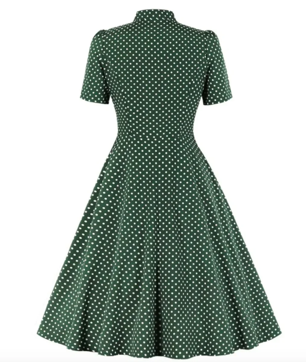 Découvrez notre modèle de robe rétro d’été verte à pois blancs, typique de la mode des années 1940 ! Son col élégant se prolonge par un ruban subtil que vous pouvez lacer à votre aise ! Juste au dessous s’étendent des boutons de perles qui créent un contraste harmonieux avec les pois blancs de cette robe vintage.
