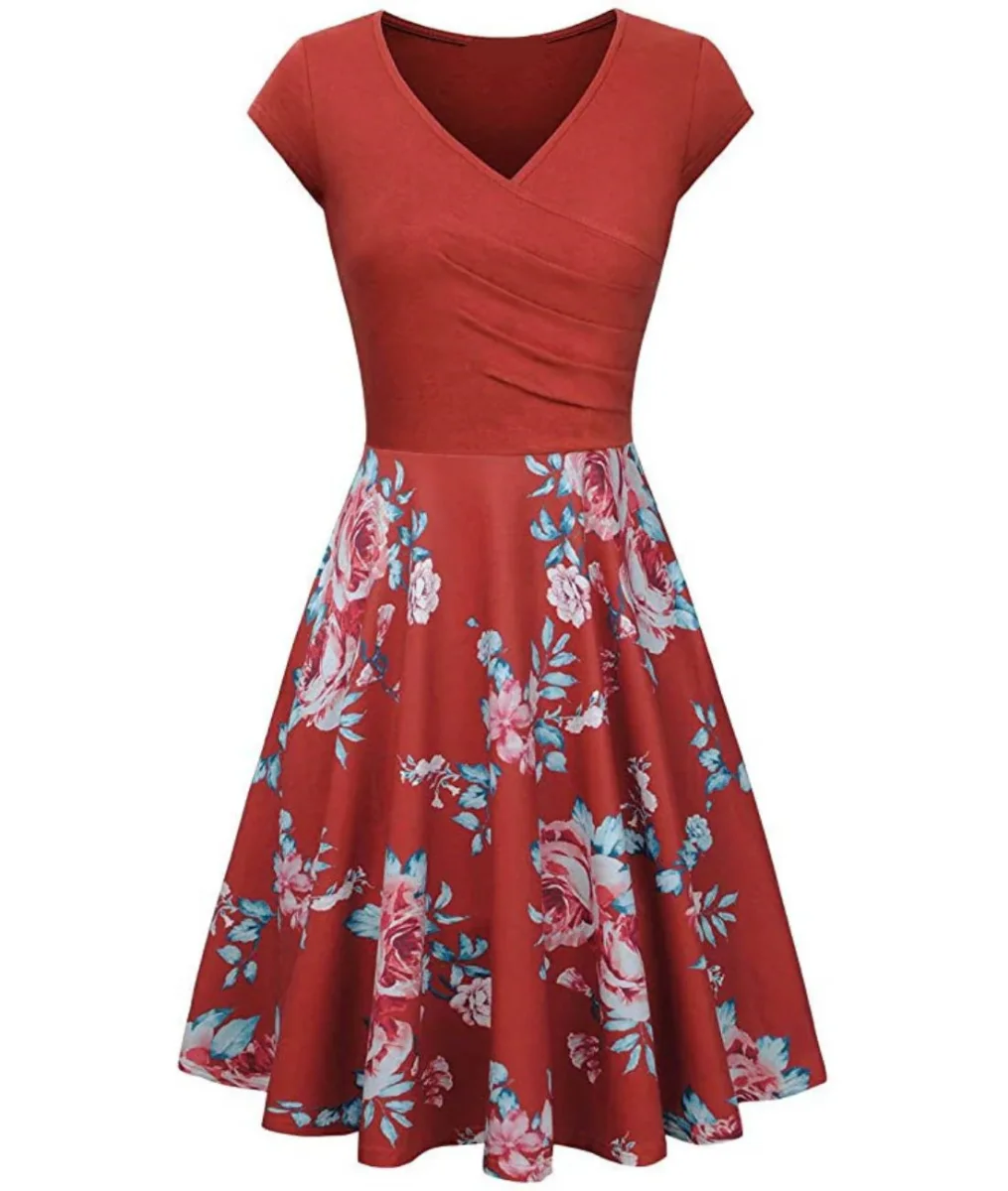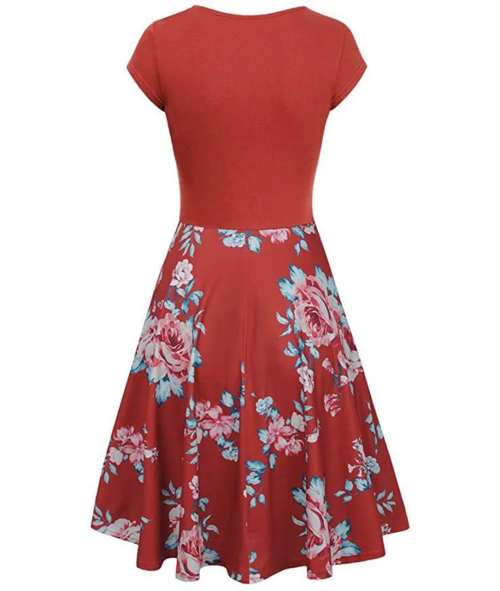 Flattez votre silhouette et séduisez la foule dans cette beauté rétro qui arbore un décolleté en coeur rouge vif. Elle est agréable à porter grâce à la sensation lisse et extensible du tissu et aux fronces diagonales légères et discrètes qui cintrent un peu plus la taille, avant de s’évaser sur la partie de la jupe ample fleurie, ce qui rend l’ensemble encore plus ravissant, accentué par ses fleurs d’été pétillantes.