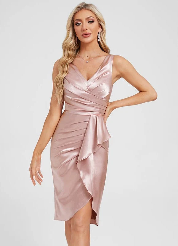Cette magnifique robe sublimera votre silhouette avec élégance et féminité. Son satin extensible de haute qualité capture la lumière, créant un effet nacré irrésistible. La coupe fourreau asymétrique met en valeur vos courbes avec son décolleté en V flatteur et ses drapés qui affinent la taille. Le volant décoratif apporte sophistication tout en dissimulant subtilement les petites imperfections.