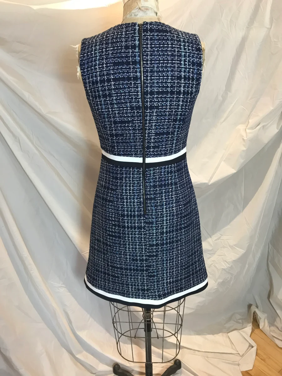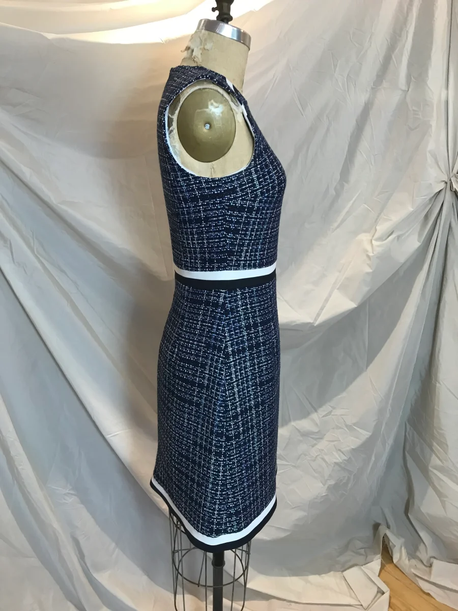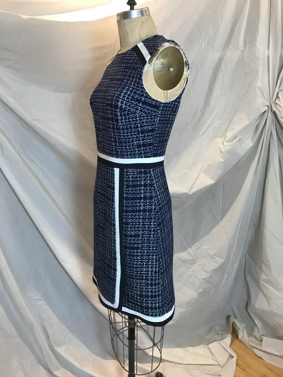 Robe tailleur en tweed d’inspiration Chanel. En mélange de fibres tissées marine et blanc. Robe classique sans manche avec fermeture éclair au dos. Jupe légèrement ligne A. De la marque canadienne JUDITH & CHARLES.