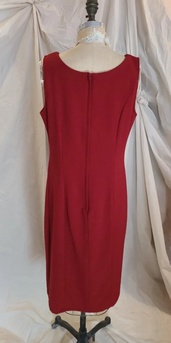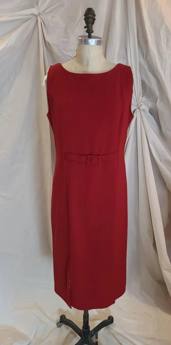 Magnifique robe tailleur rouge de la marque NATHALIE B, vintage. Cintrée, deux fentes au bas. Fermeture éclair au dos. Petite ceinture cousue sur la taille. Fit L Poitrine 40 po Taille 34 po Hanches 38 po Longueur 43 po N’a plus d’étiquette. Probablement polyester Fait au Canada État 9/10