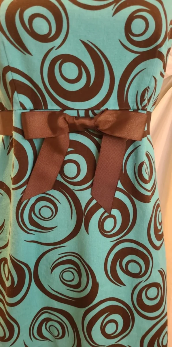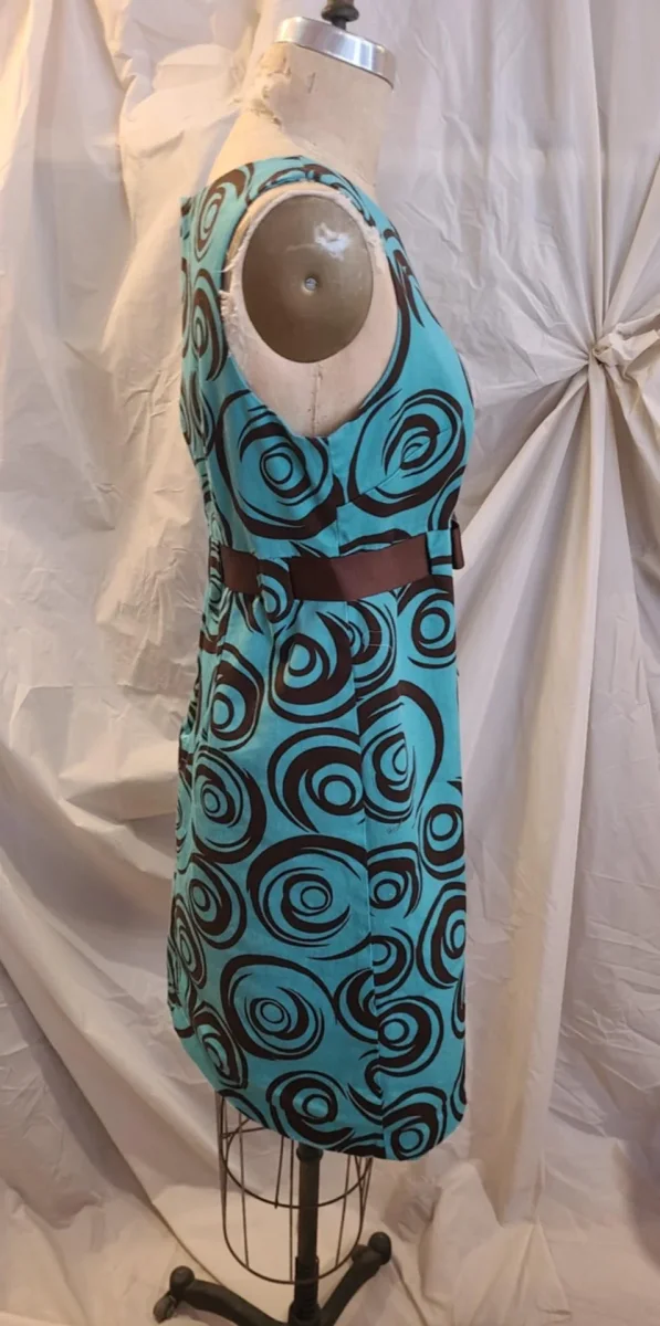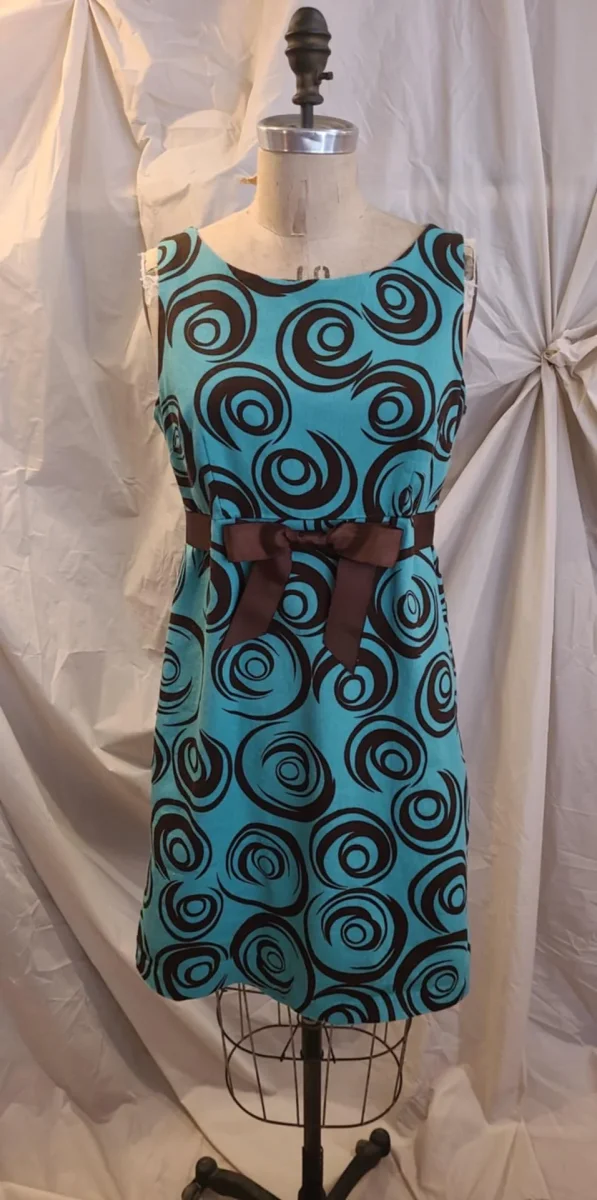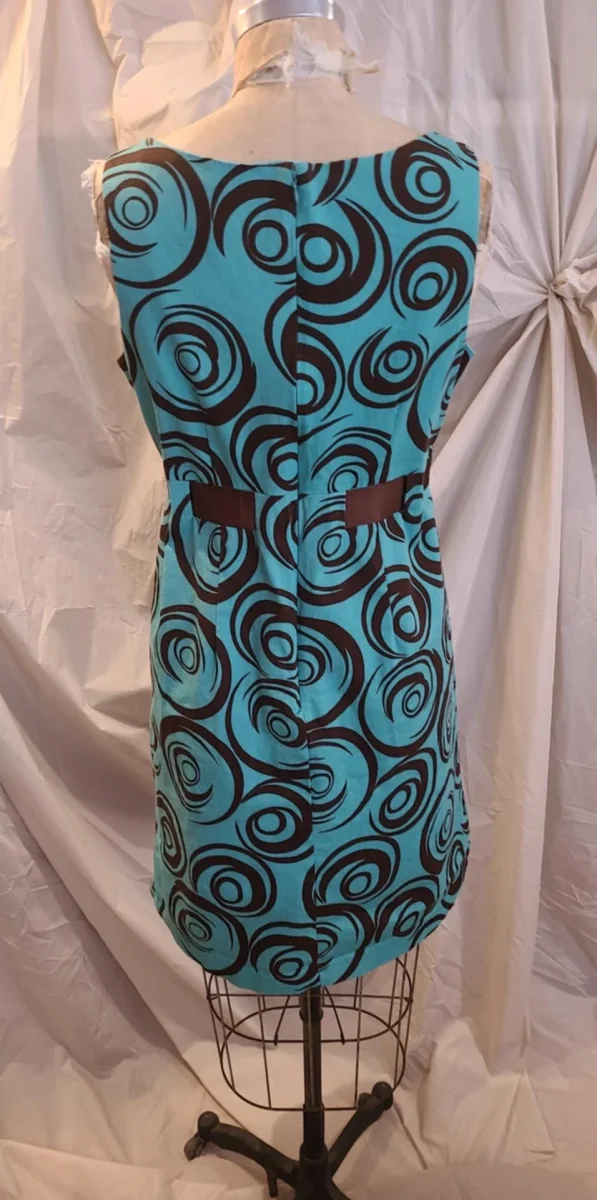 De la marque JESSICA HOWARD, vintage. Sans manche. En coton turquoise à motifs spiralés marrons. Ruban marron à la taille. Beau look sixties, mais probablement des années 1990.