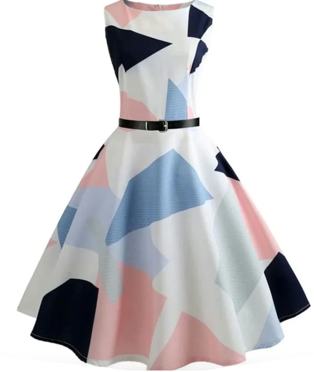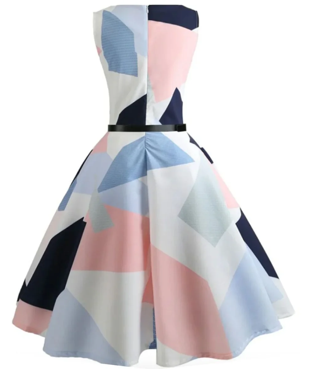 Découvrez l’originalité rétro et chic de cette jolie robe à à motifs style cubisme, ajustée sur le haut et évasée au bas !