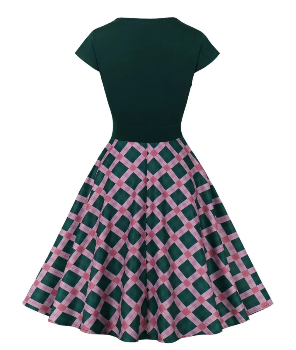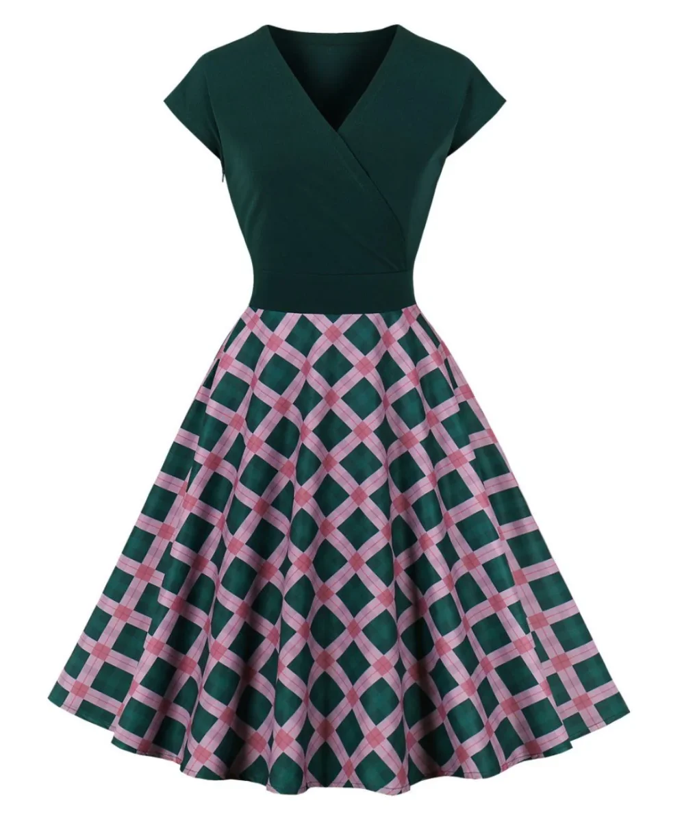 Le haut de cette robe est vert foncé intense et chic, apportant un air mystérieux et mesuré. Il est complété par un décolleté croisé en V qui saura mettre en valeur le buste féminin. Le bas de la robe arbore un contraste de un motif à carreaux rose et vert, créant un effet visuellement très original et osé, mais réussi. Les carreaux dans ces teintes vives ajoutent une note ludique et réellement vintage à la tenue, évoquant l’esprit joyeux des années 50.